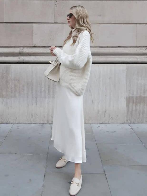 灰色针织衫+白色半身裙