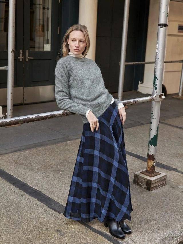 浅灰色V领针织衫能拉长颈部线条,宽松落肩设计藏肉显瘦;搭配垂感好的米白色缎面A字裙,温柔干练且包容腿型,职场与日常场景无缝切换。