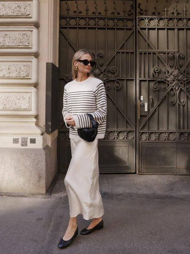慵懒通勤:条纹毛衣+亚麻阔腿裤,搭配帆布鞋,弱化“班味”。
