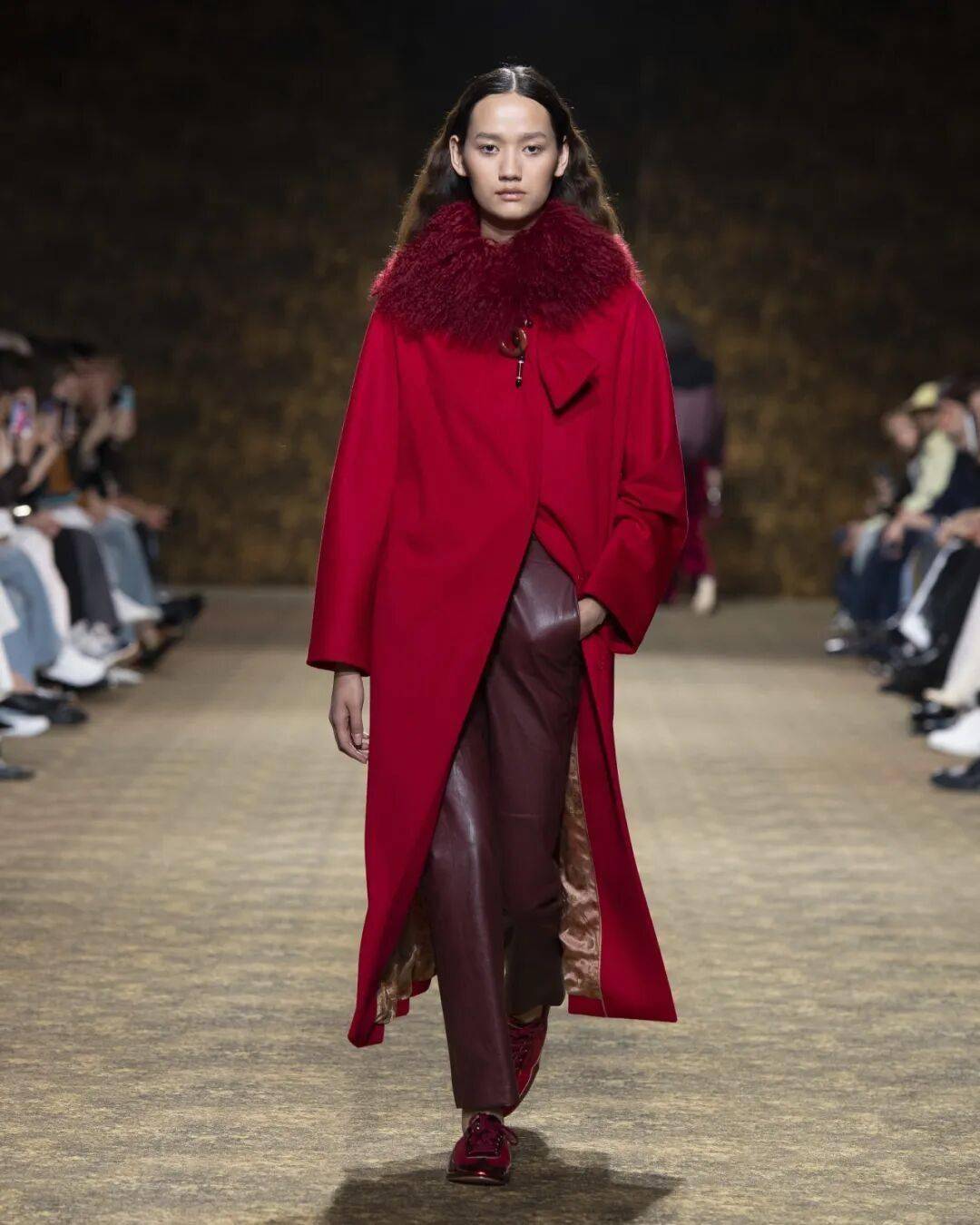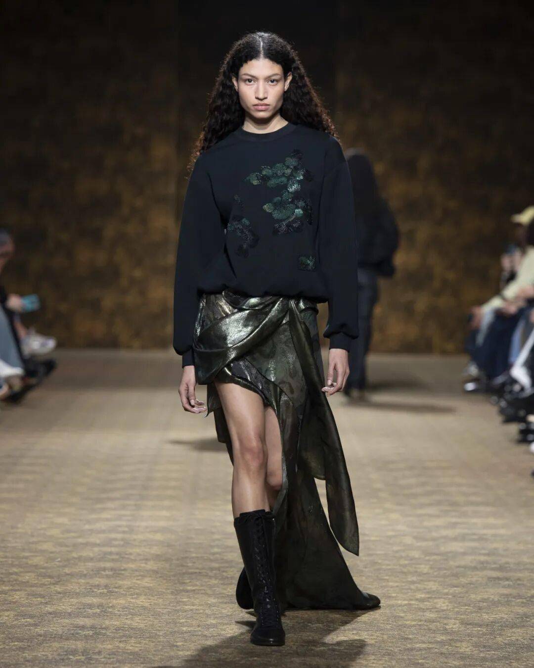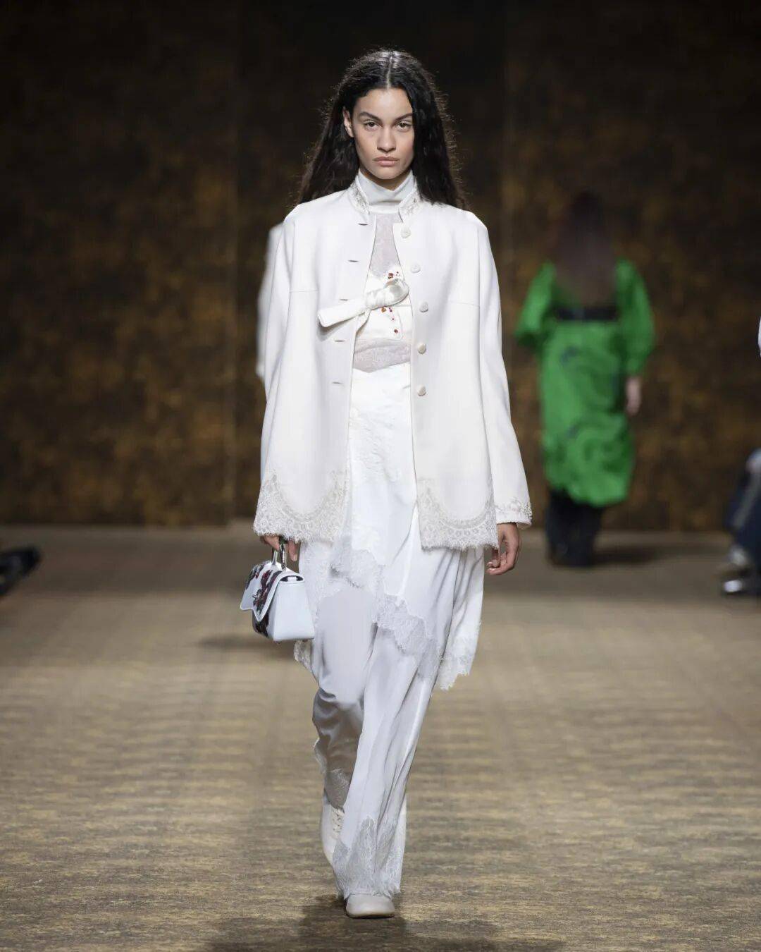 踏入秀场空间,恢宏壮阔如一幅穿越大唐的流动画卷:宫廷的出游、山水的行旅,随模特步伐徐徐展开,衣裳飘逸间,廓形、色彩、细节,无不在向我们娓娓道来着那个璀璨的大唐,也诉说中东方文化的当代转译。
