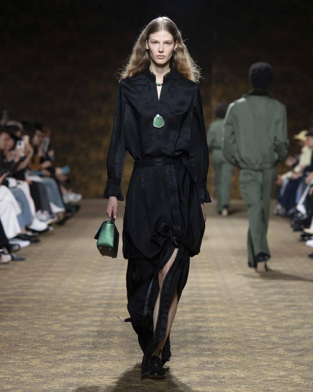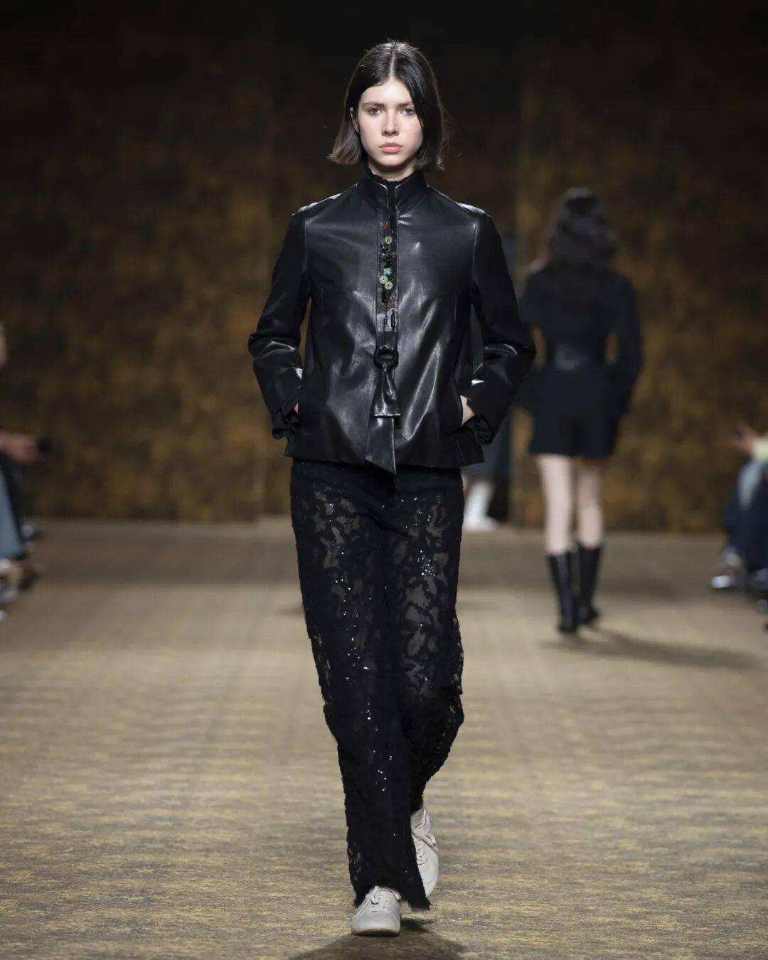 品牌代言人刘宇身着夏姿・陈早秋系列皮革套装现身秀场,深棕皮质夹克以利落剪裁暗藏锋芒,内搭刺绣白衬衫搭配玉石妆点领带,以「玉」为引,赴约这场跨越时空的东方美学之旅。