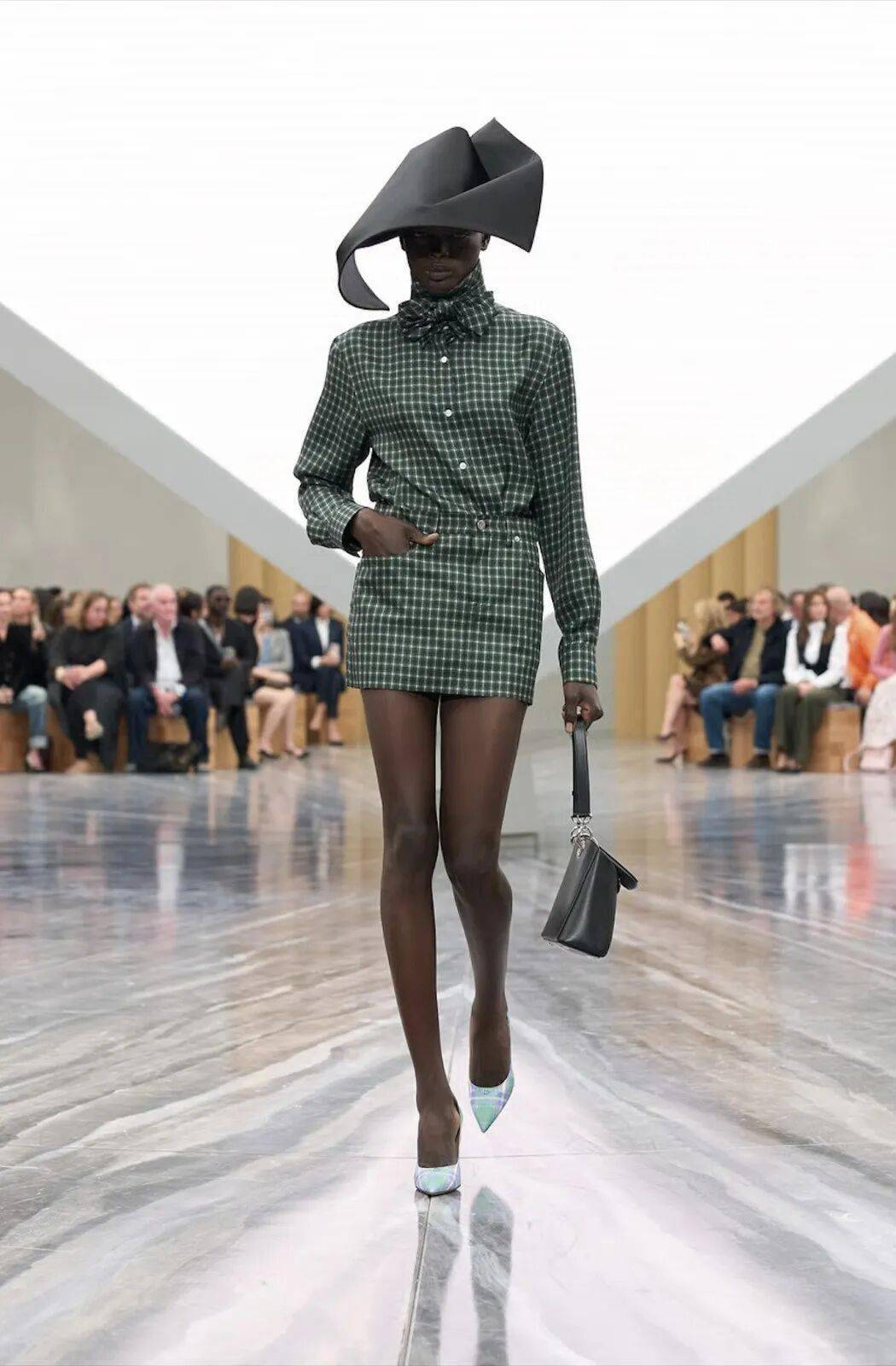 香奈儿宇宙系列中,Matthieu Blazy以酒红丝绸衬衫配米灰格纹过膝裙,通过不对称剪裁赋予长裙叛逆基因,打破"短裙即自由"的单一逻辑。