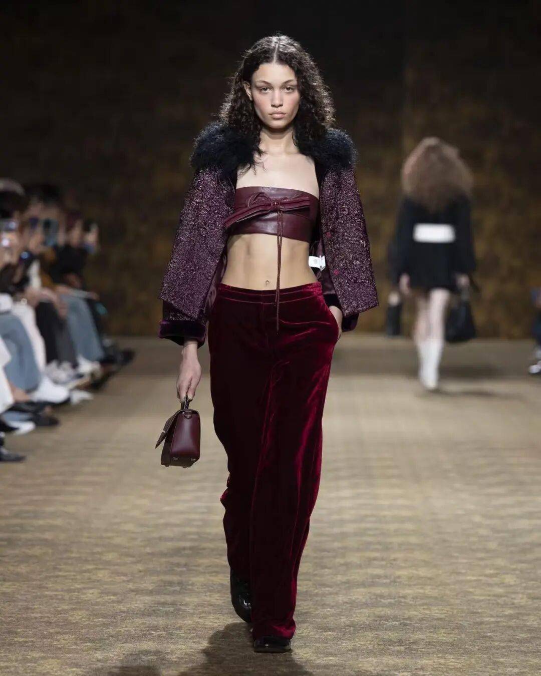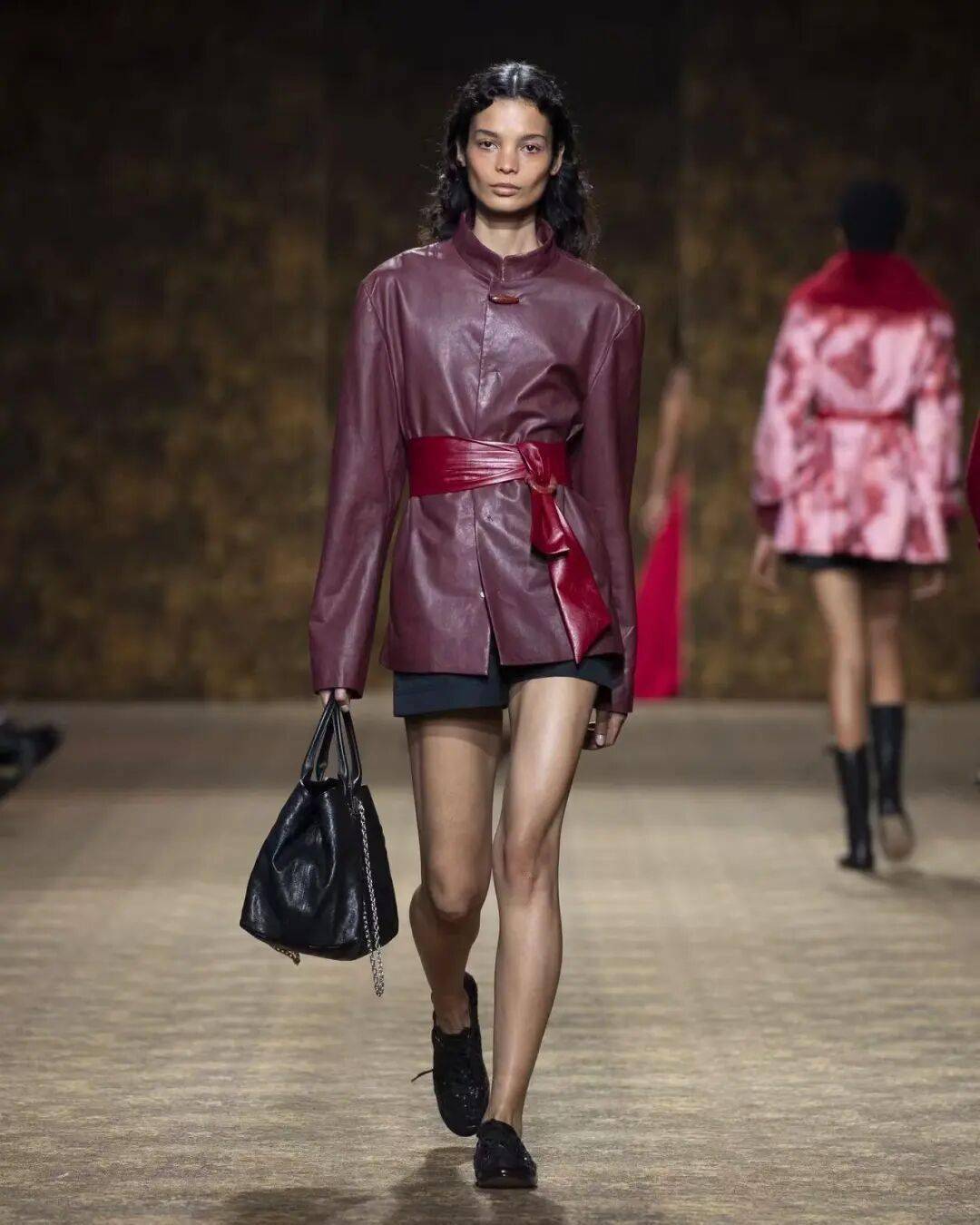 材质革命:将斜纹软呢注入羽毛般流动性,酒红丝绸与薄荷巧克力色方包形成色彩张力,在"轻盈与力量"间寻找平衡点。