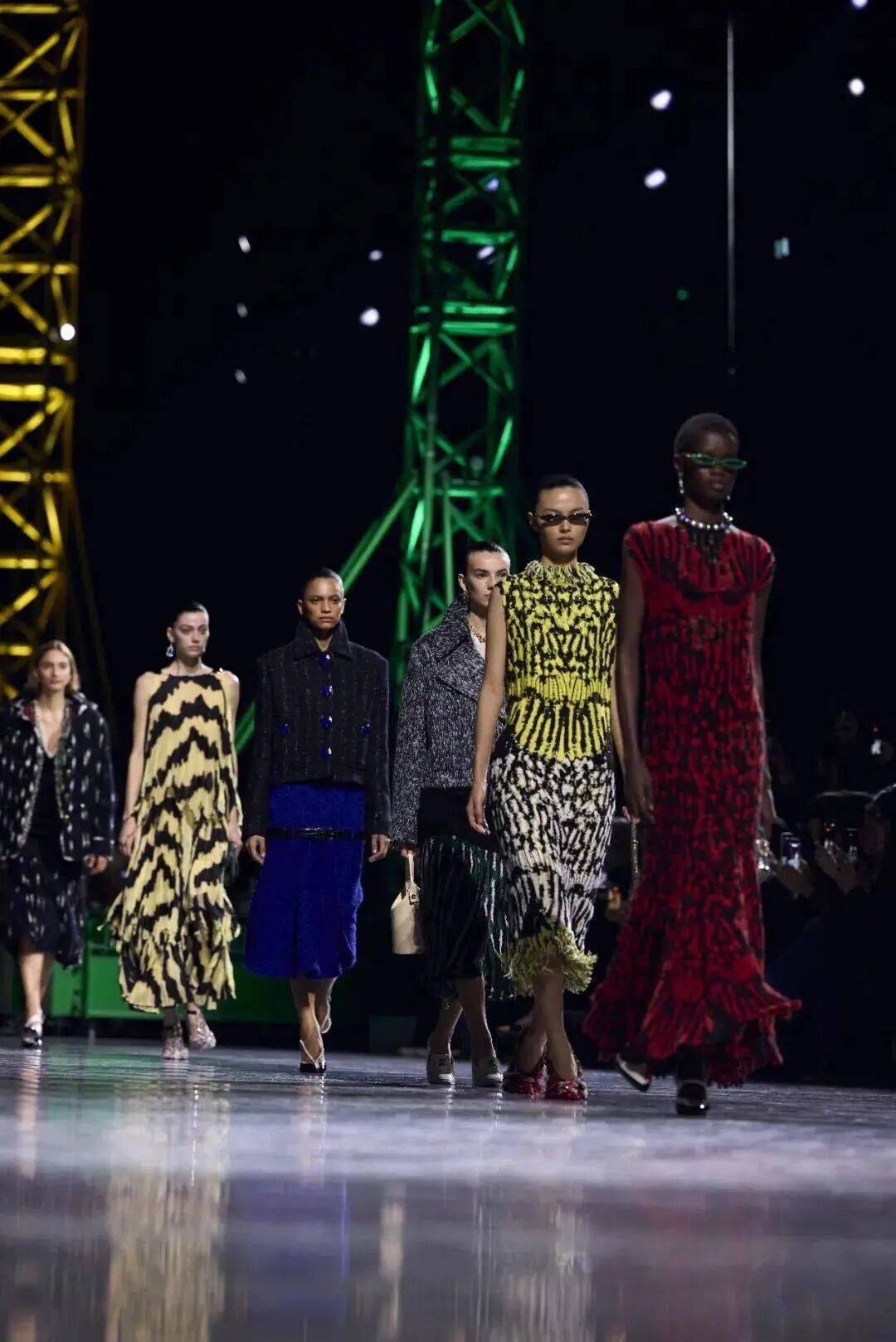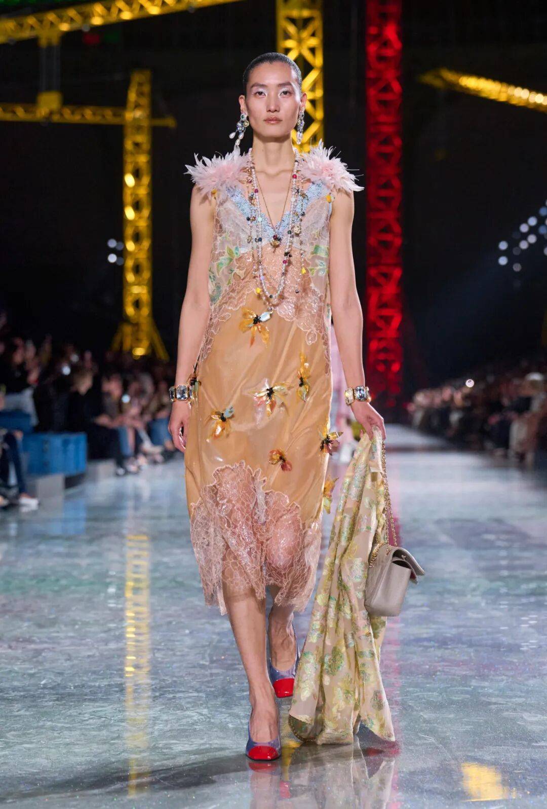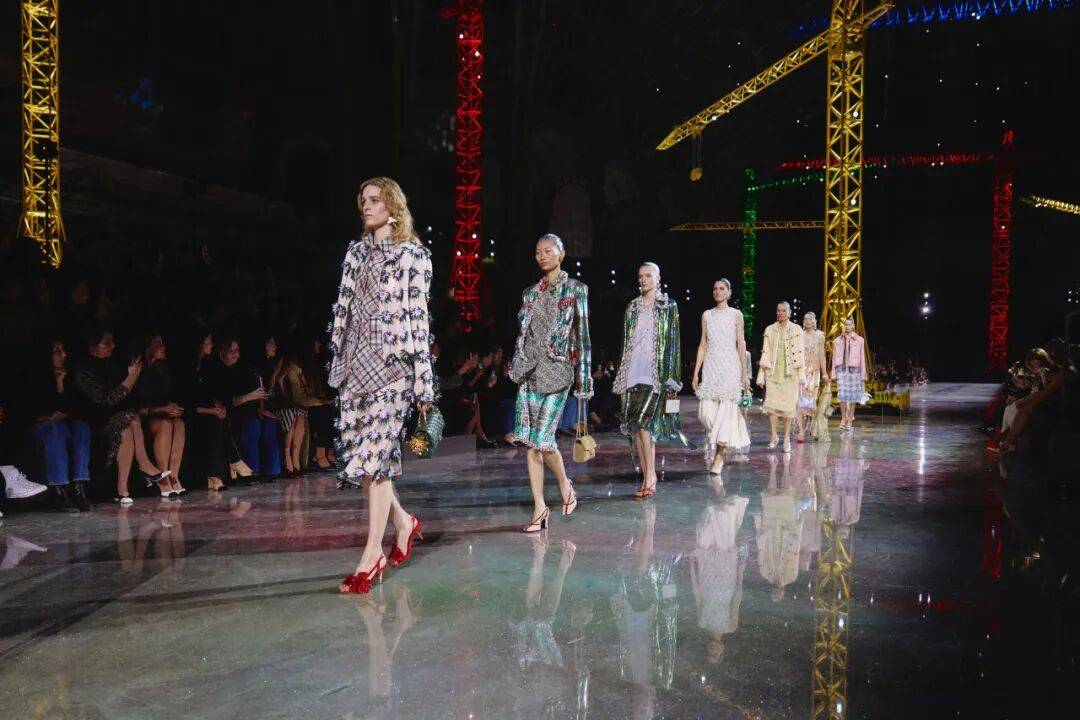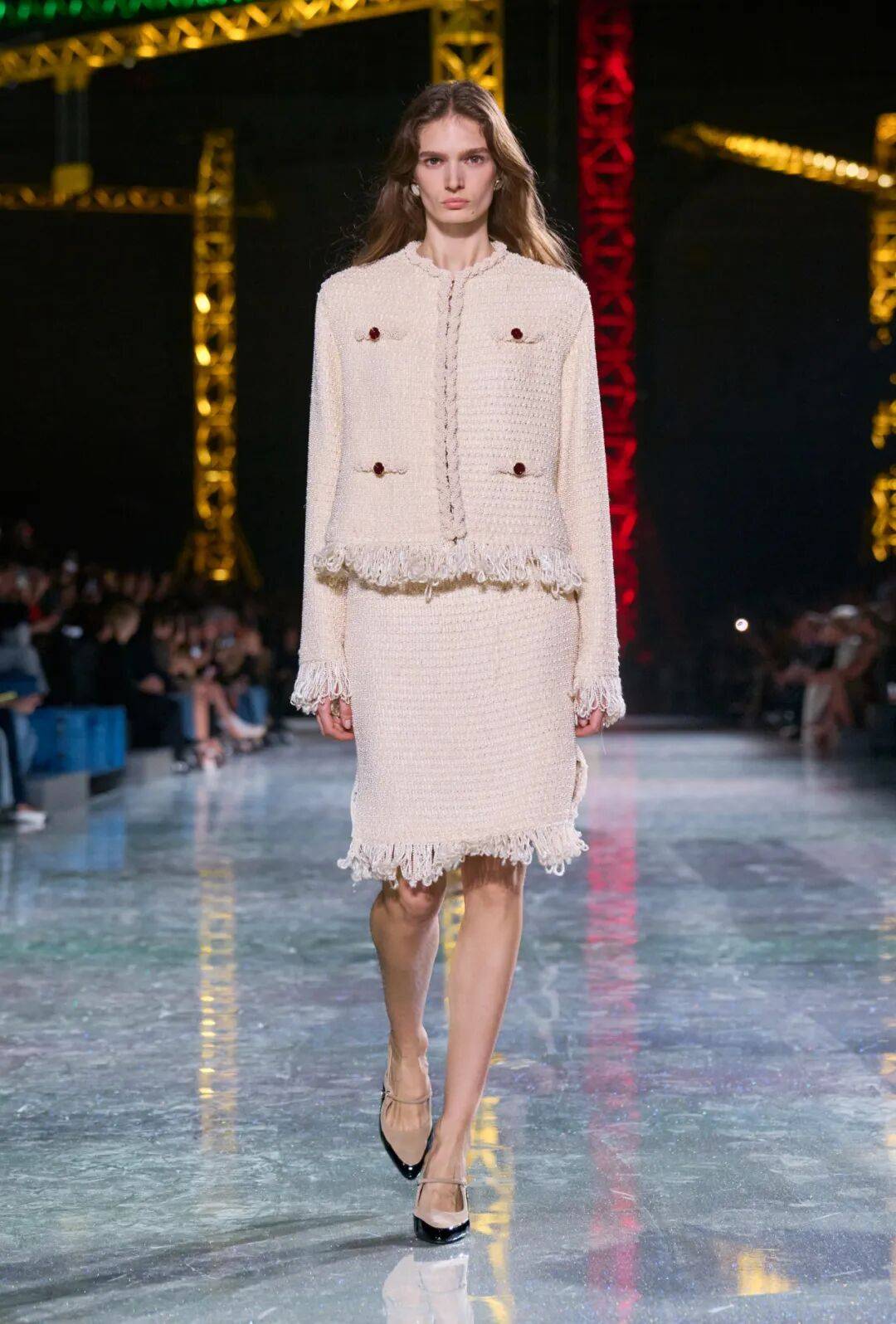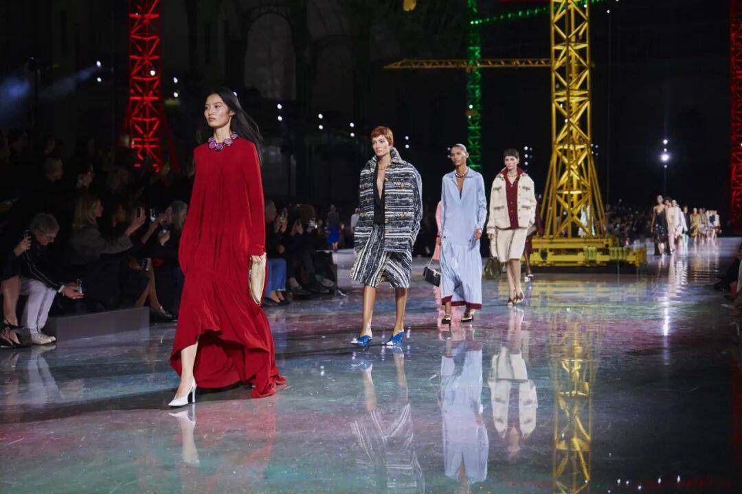 走出星际宇宙和蘑菇森林,香奈儿精品部创意总监Matthieu Blazy再次致意想象的意境世界——熟悉的巴黎大皇宫被巨型吊臂与交错的灯光改造成一个巨大的“构建世界”。