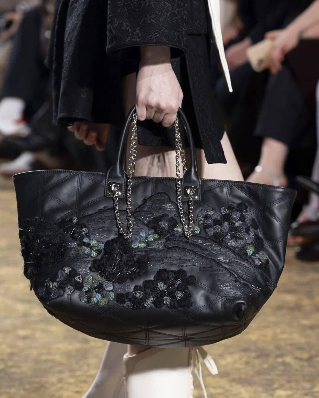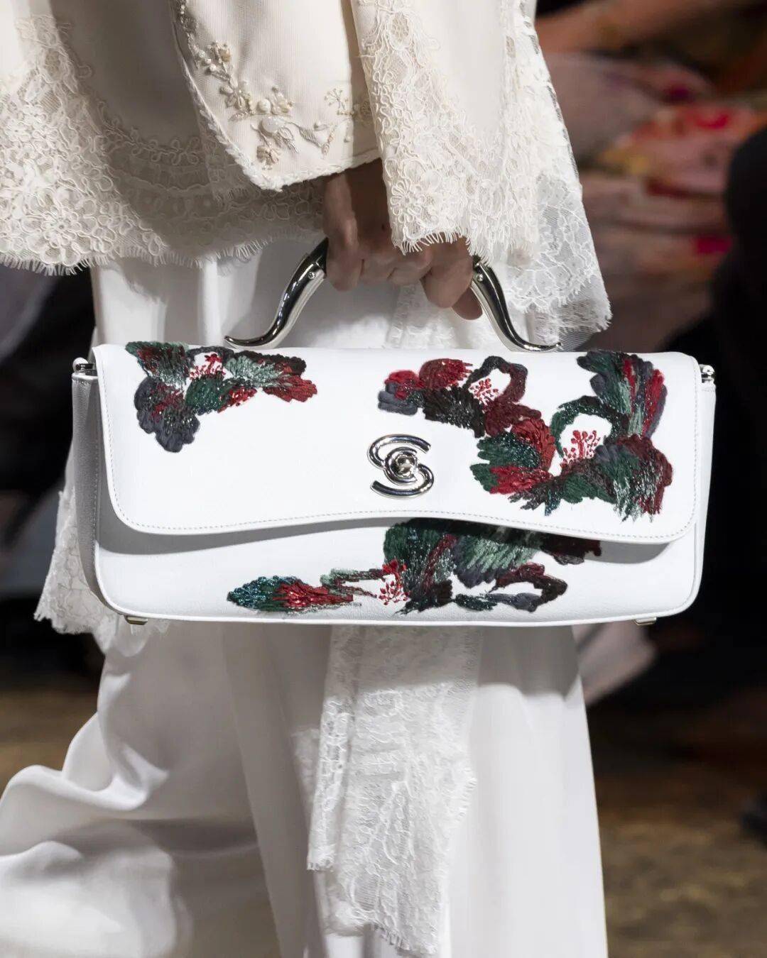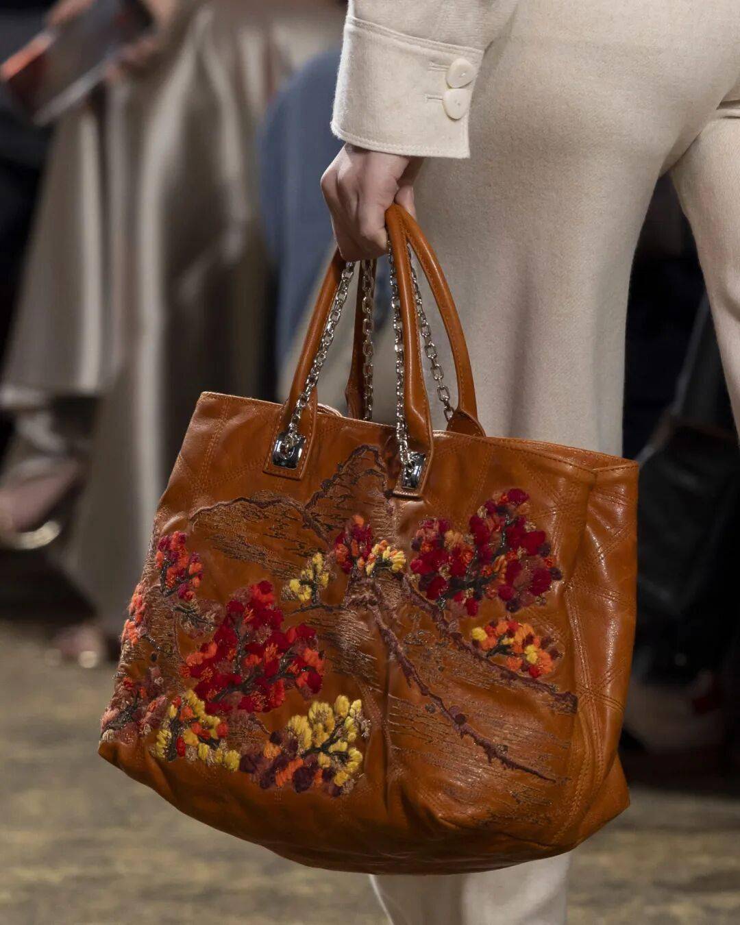 本季全新包款的细节更加值得细细欣赏:长型包萃取玉镯的圆润轮廓,金龟子绿、红与白的撞色带着古典雅韵,山水纹样与毛线钉绣交织,搭配玉质提把,让每一只包都成为可随身携行的东方诗意图景。