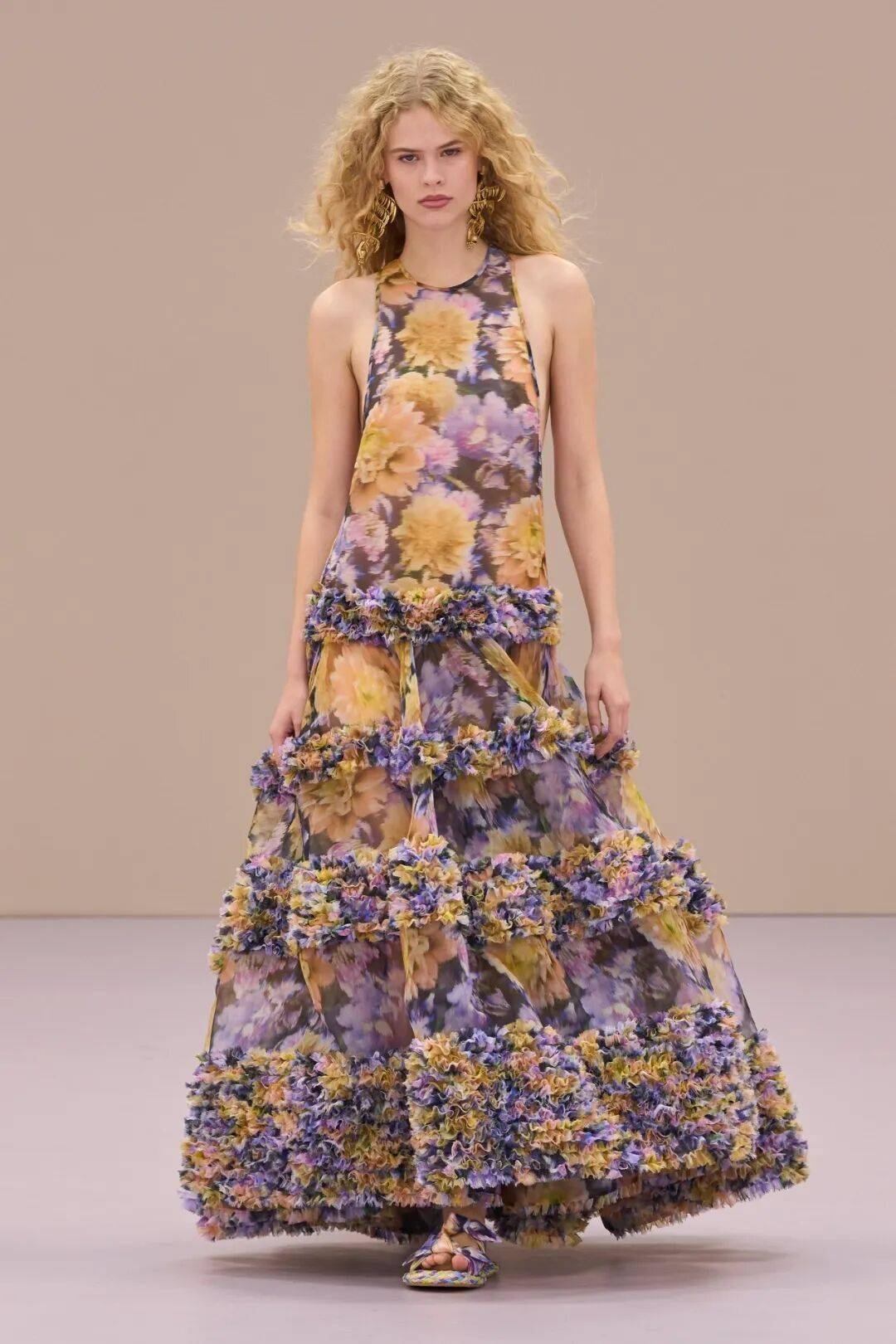 裙摆上花朵肆意铺展,如献给黄昏的十四行诗,每道褶裥里都藏着日光与晚风。