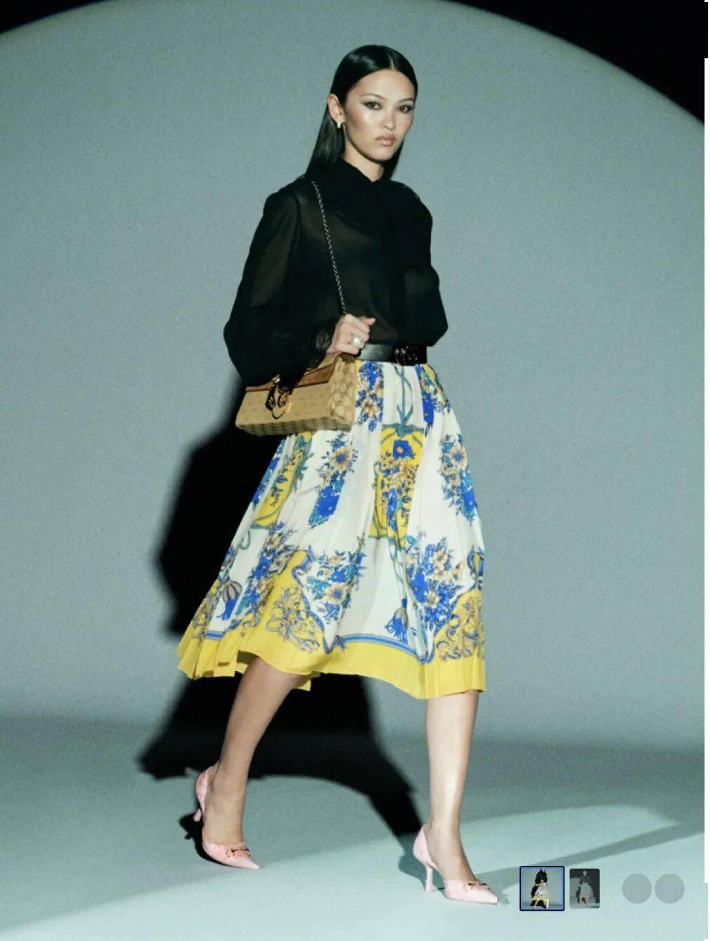 田园碎花因缩短的裙长而气质鲜活,粉与绿的经典搭配,因饱和度降低而和谐共生。上装的优雅中和下装的性感,碰撞出轻松活力的学院气息。