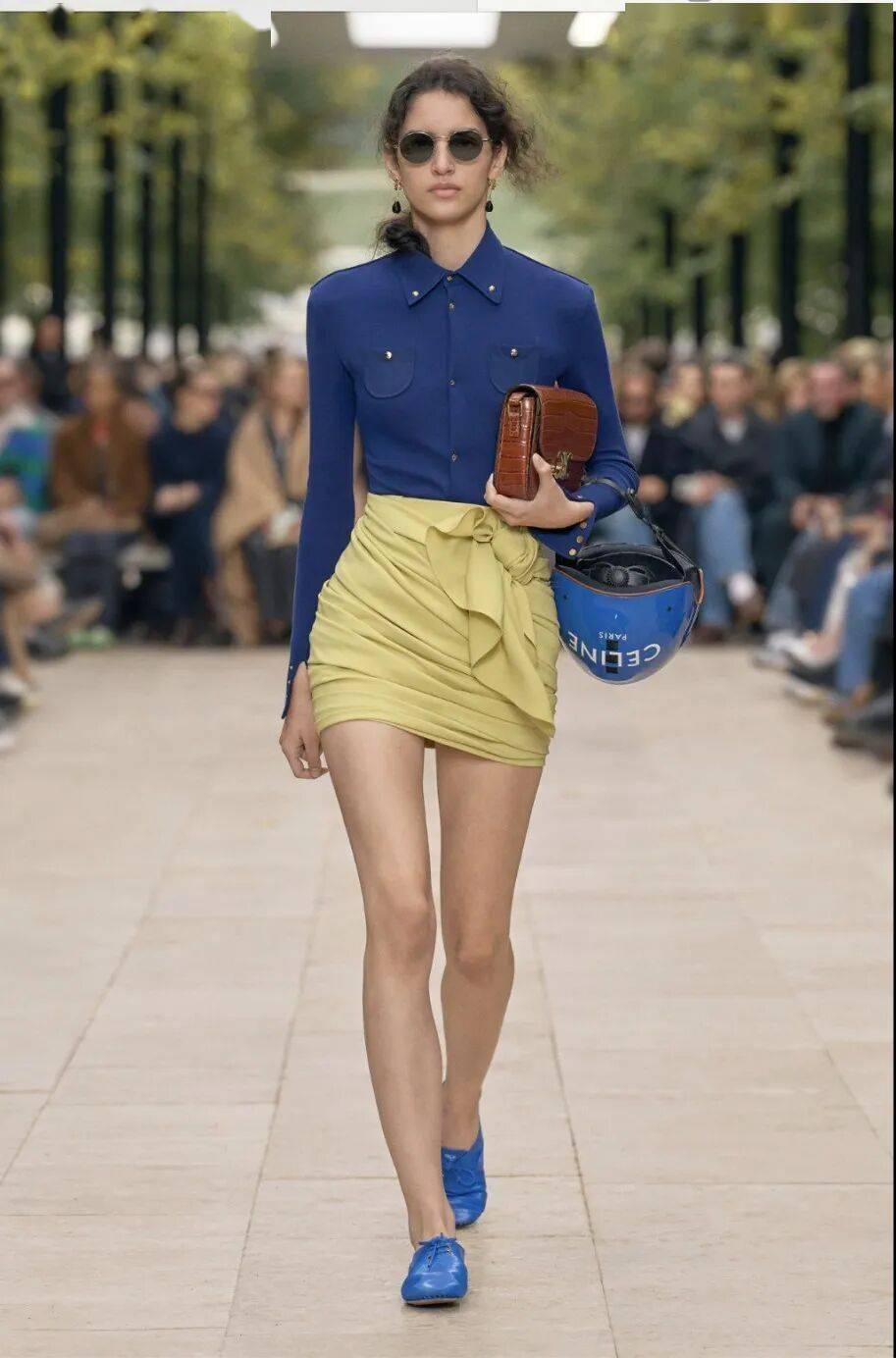 蓝与黄的碰撞。一组视觉冲击力的对比色。腰间的褶皱和蝴蝶结让短裙丰富了细节。似乎是在方寸之间充满了内容。细节的丰富让短裙少了性感多了雅致。