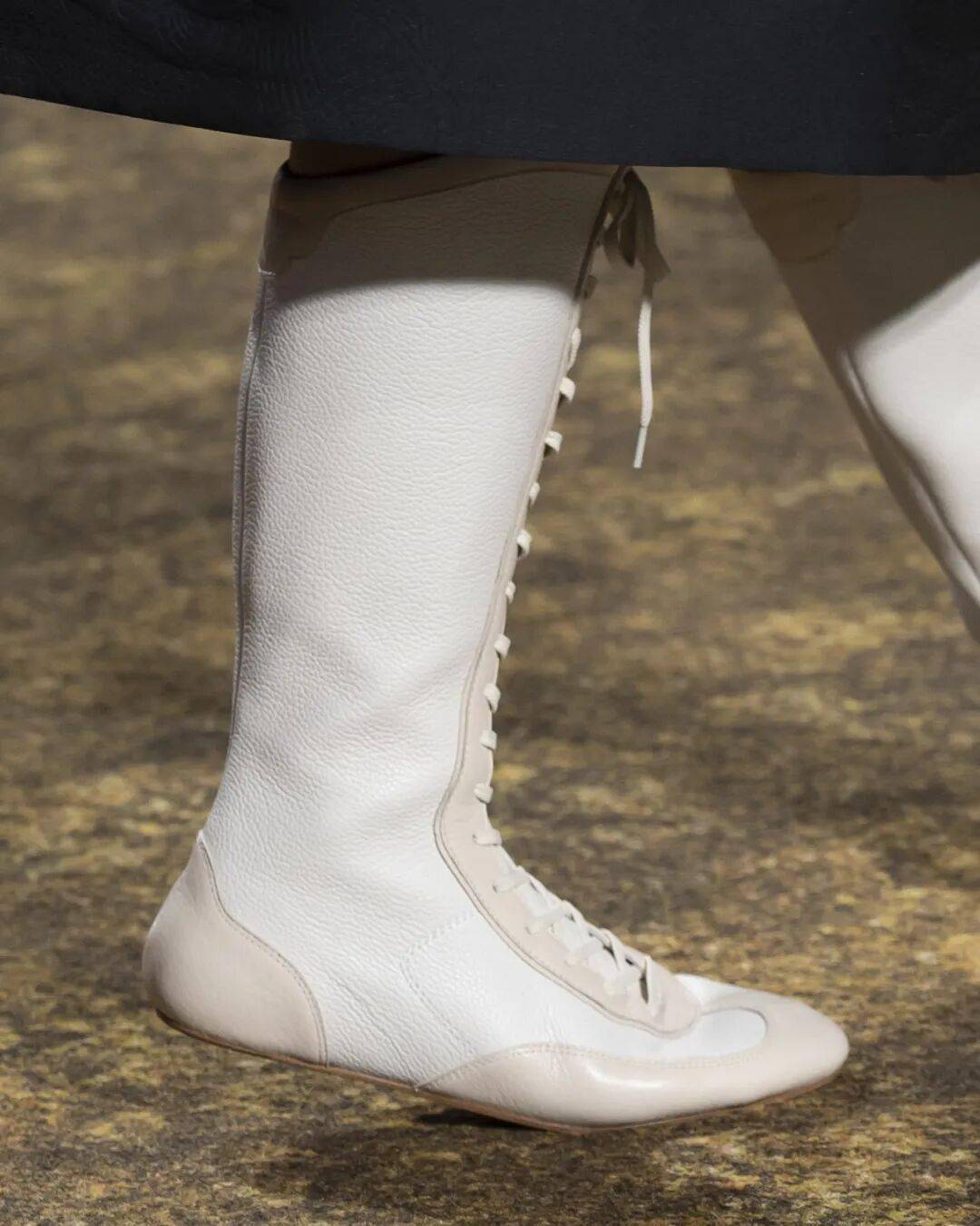 仿佛第二层肌肤般服帖的拼接装饰长靴,则采用了质感柔软细腻的粉彩调皮革打造,延续了新季系列的梦幻气息,也充满了实用主义的浪漫。