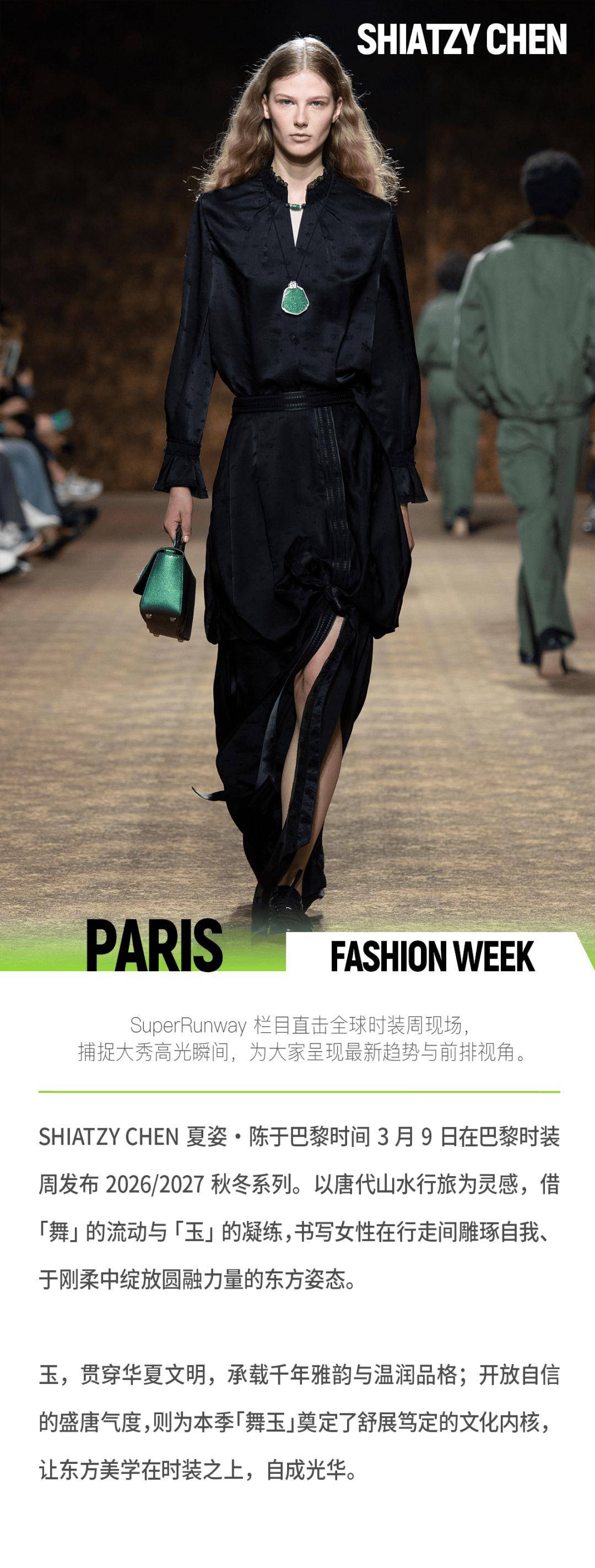 SHIATZY CHEN 夏姿·陈2026/2027秋冬系列,不是一场简单的盛唐复刻,而是一场跨越千年的美学对话,更是一次东方精神的当代回响。当「舞」的流动遇见「玉」的凝练,当盛唐的开阔气度碰撞当代的审美追求,我们看到的,不仅是时装上的东方韵致,更是当代人所追寻的精神内核——那份不刻意、不张扬的从容,那份刚柔并济的坚定,那份在快节奏时代里,对自我圆融的坚守与雕琢。