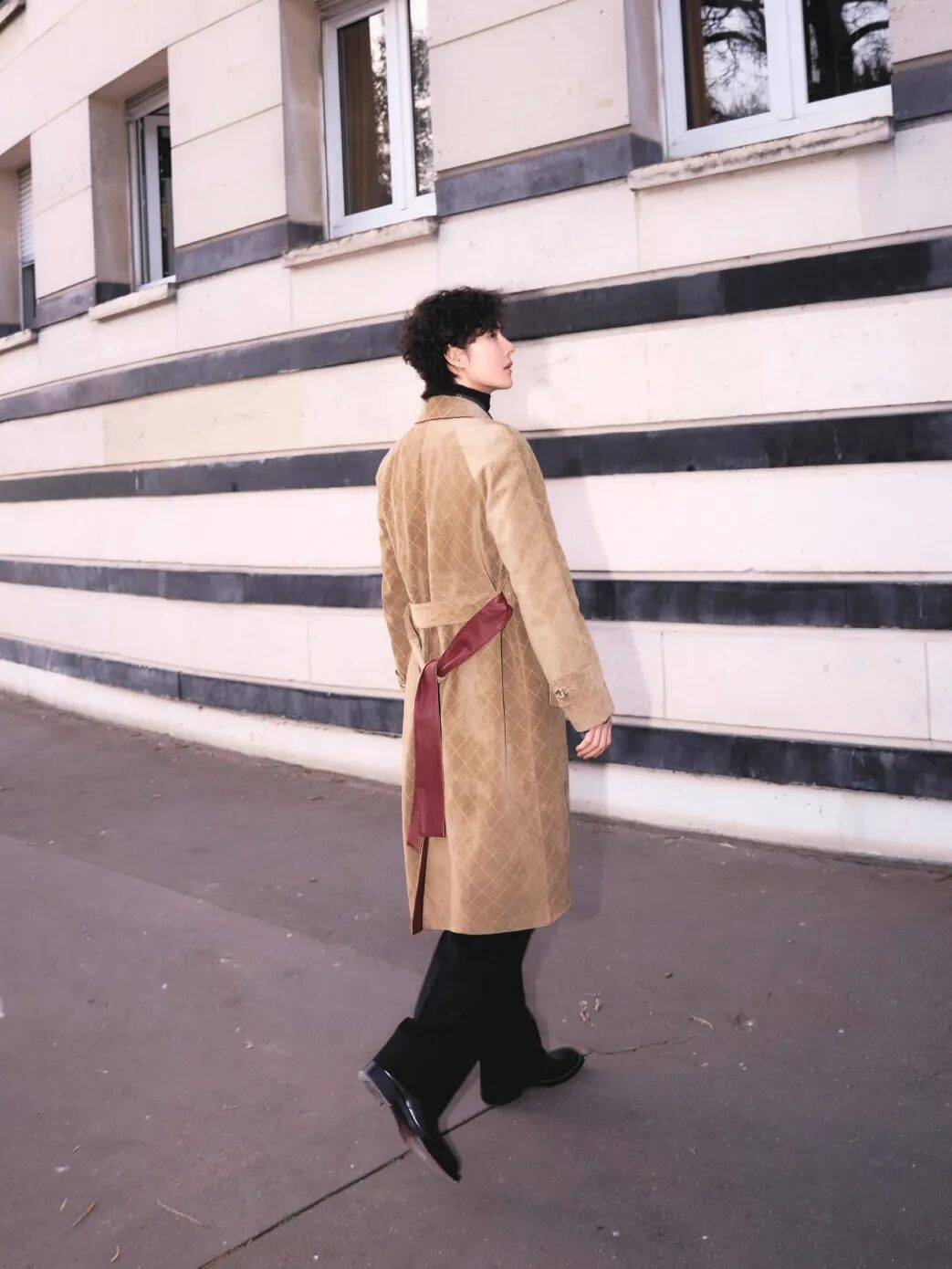 其中,王一博的造型来自品牌2026高级手工坊系列,以米色菱格纹麂皮大衣搭配深蓝色斜纹软呢衬衫。