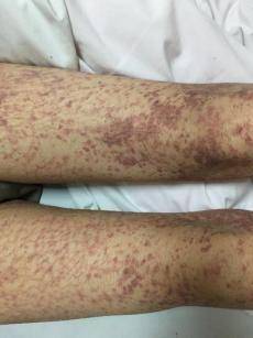 ·其中皮疹最常见,表现为下肢为主的紫癜或瘀点,常对称分布,高出皮面,压之不褪色,很容易与皮下出血鉴别,见下图。皮肤活检可见IgA沉积为主的白细胞碎裂性血管炎。