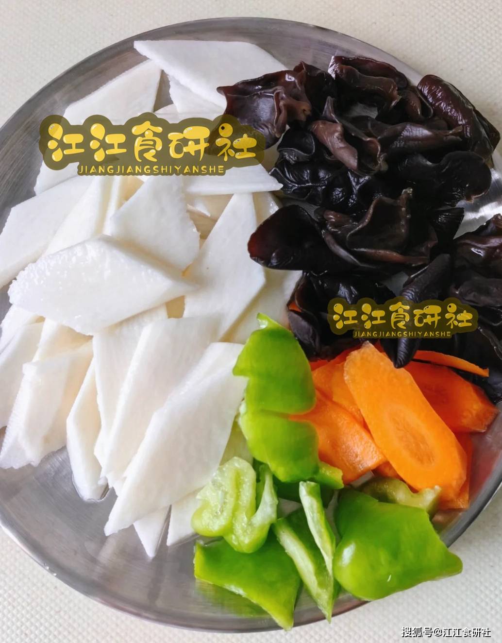 3、焯水定色:锅中烧水,水开后先放入木耳,焯烫一分钟捞出。接着在水中加一小勺盐和几滴油,倒入山药片、胡萝卜片和青椒片,焯烫约30秒,看到山药边缘变得透明,立刻捞出,迅速过一遍凉水。这样能保持蔬菜鲜艳的色泽和爽脆的口感。
