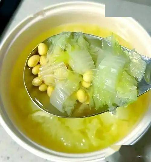 4、煮好后只喝汤即可,黄豆和白菜也可以一起食用,味道清淡不厚重,温和不刺激肠胃。