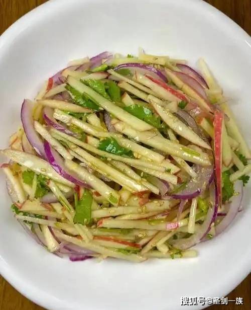 3. 把洋葱丝和苹果丝放在一起,加少许盐、1勺白糖、1勺白醋,滴几滴香油。