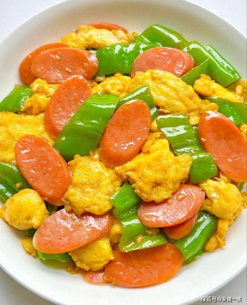 2. 热锅倒油,鸡蛋炒成块盛出;不用洗锅,直接下火腿肠翻炒10秒,加少许盐(1分钟)。
