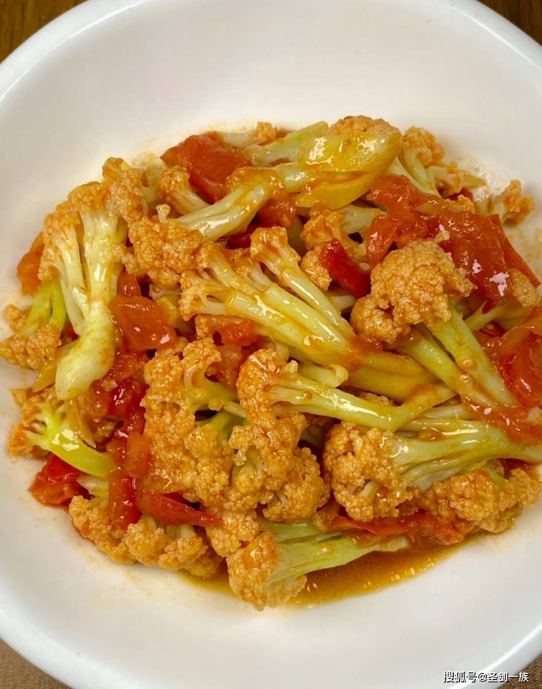 5. 放入沥干水分的花菜,继续翻炒,使花菜均匀裹上番茄汁。
