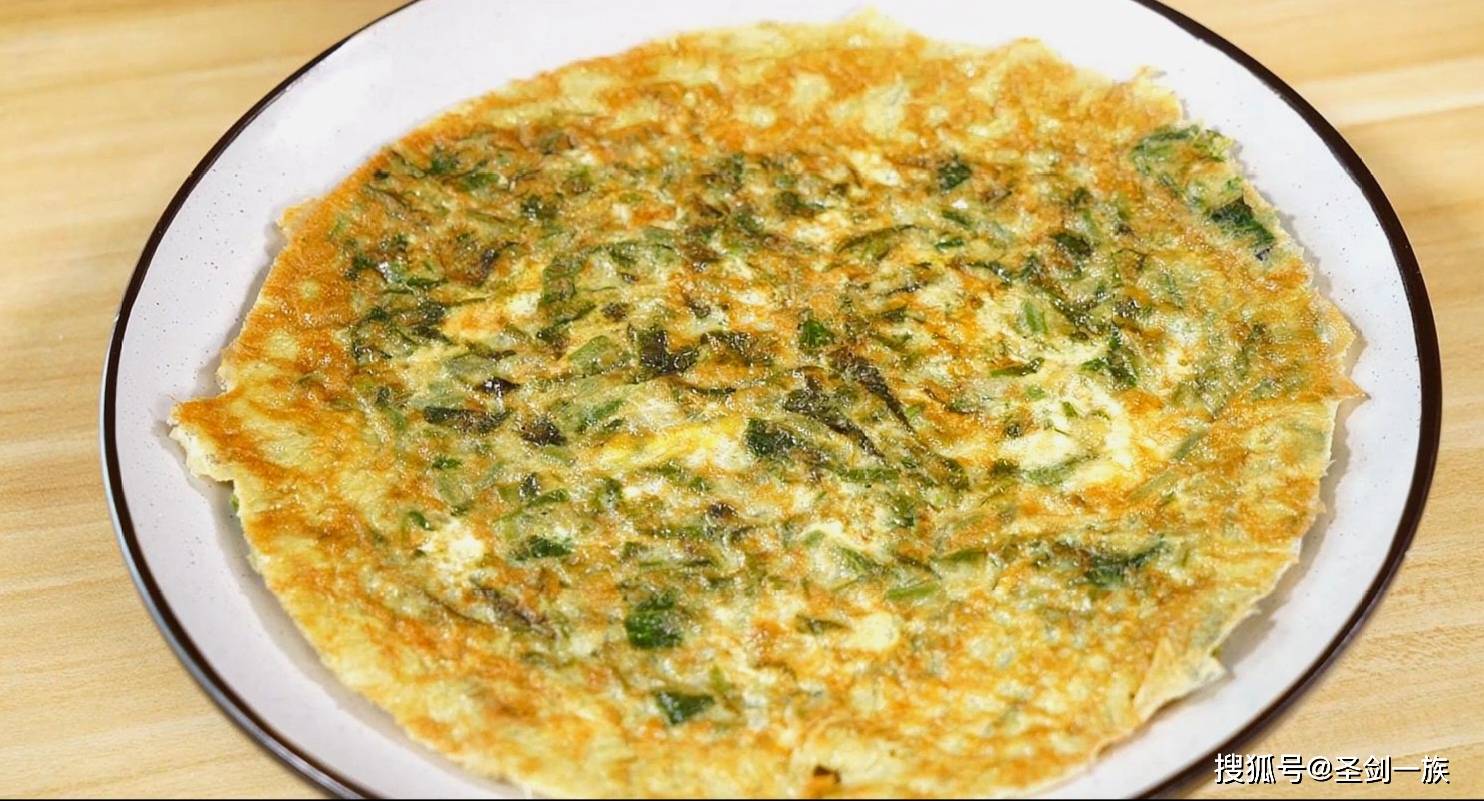 4. 热锅凉油,倒入香椿鸡蛋液,小火慢煎,一面煎至定型后翻面,煎至两面金黄,不用炒太碎,盛出即可。