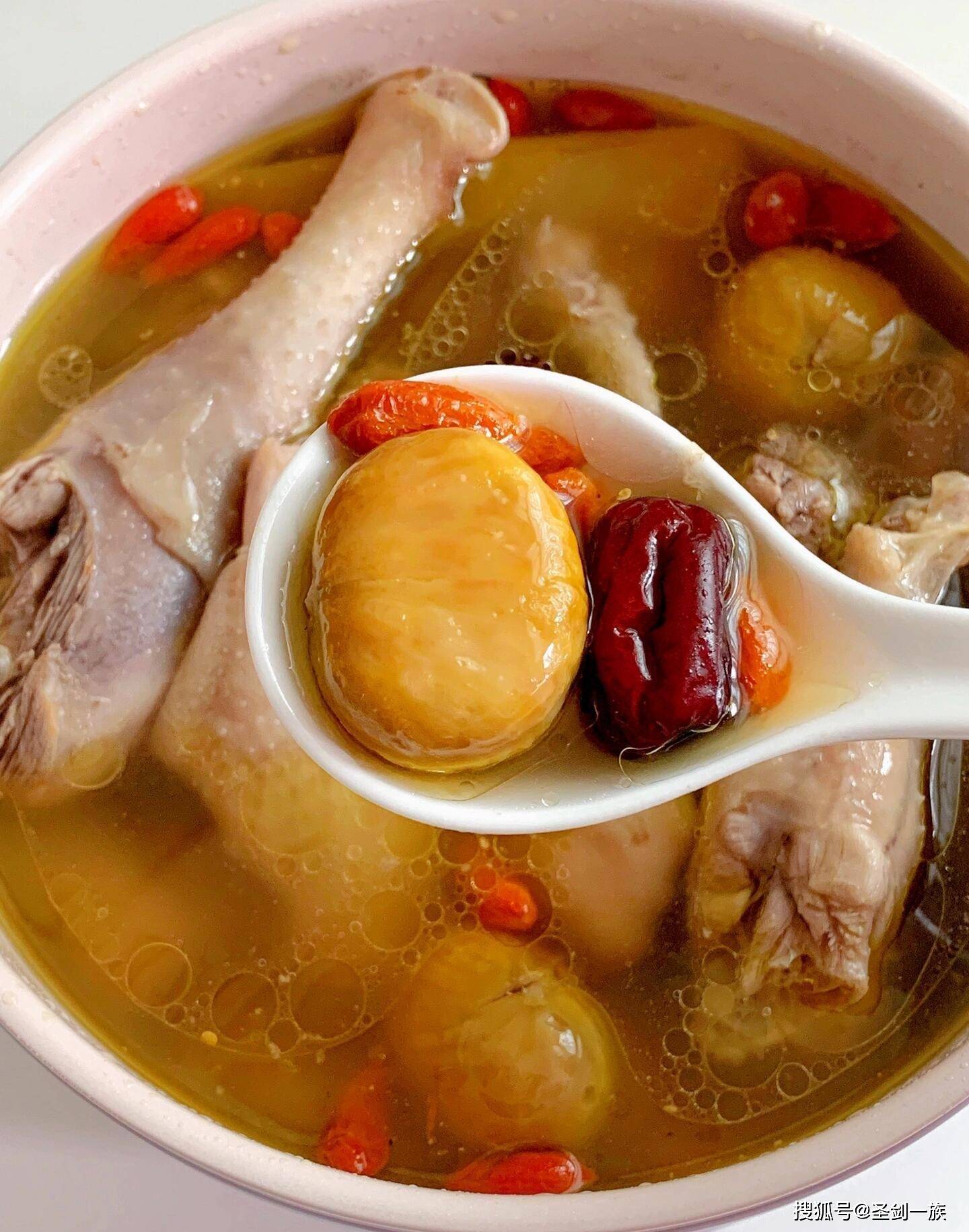 3、将鸡肉、板栗、干香菇、莲子、红枣和姜片都放入汤锅中,加入足量的清水,盖上盖子炖煮一个小时。