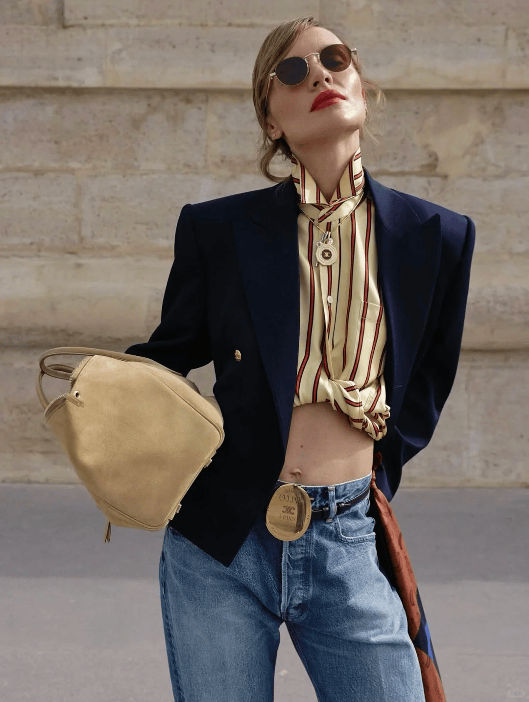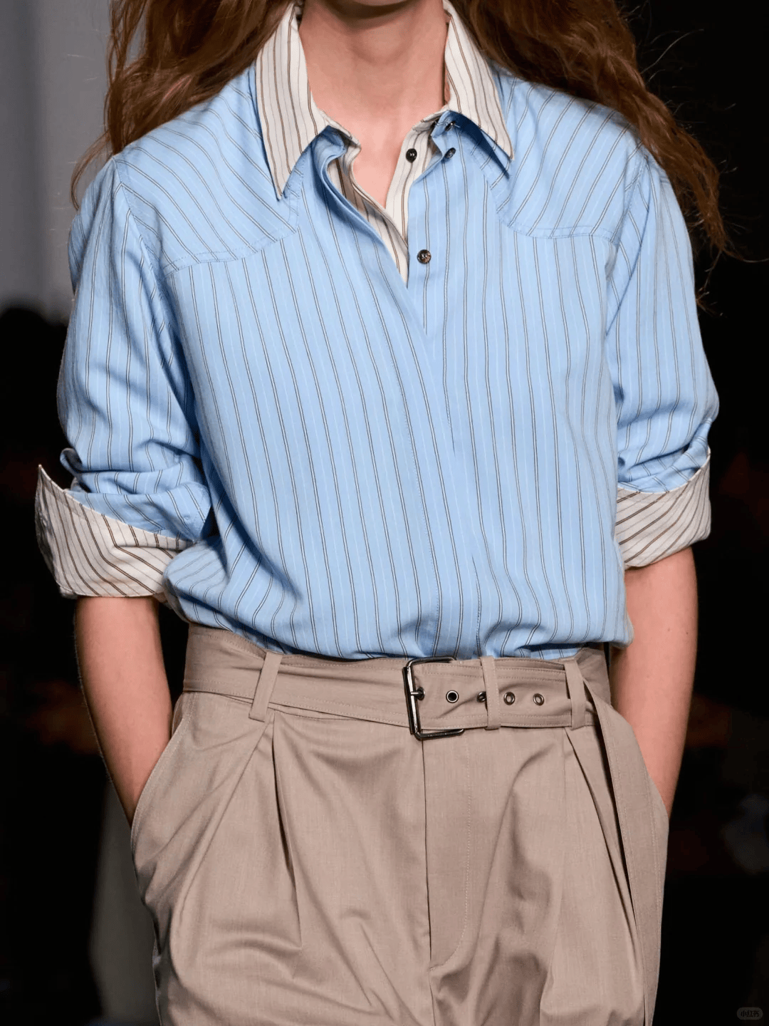 特点:竖条纹是“显瘦神器”,今年更强调“层次化”——细条纹比粗条纹更低调,蓝白、黑白配色最经典,能纵向拉长上半身轮廓,修饰肩宽、胸大等问题。