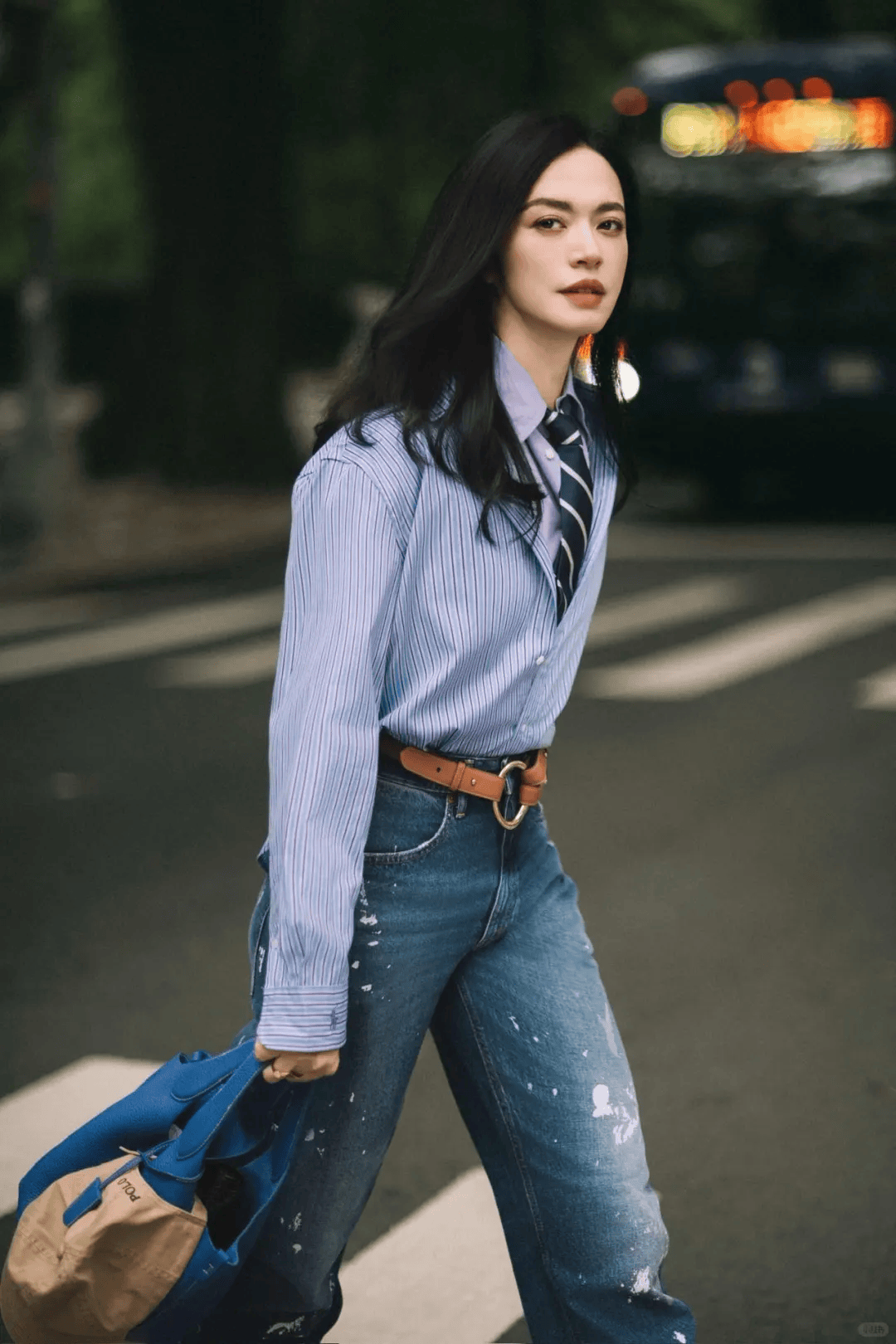 百搭法则:配西装裤显通勤干练,搭牛仔裤显休闲,甚至能与条纹外套叠穿(不同粗细条纹碰撞),适合日常、职场等多种场景。