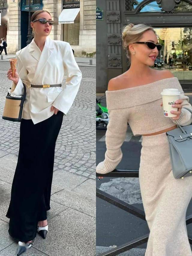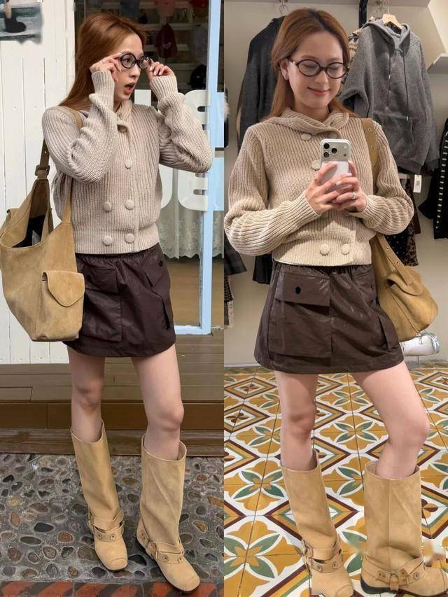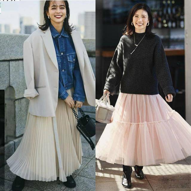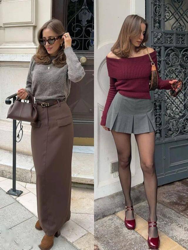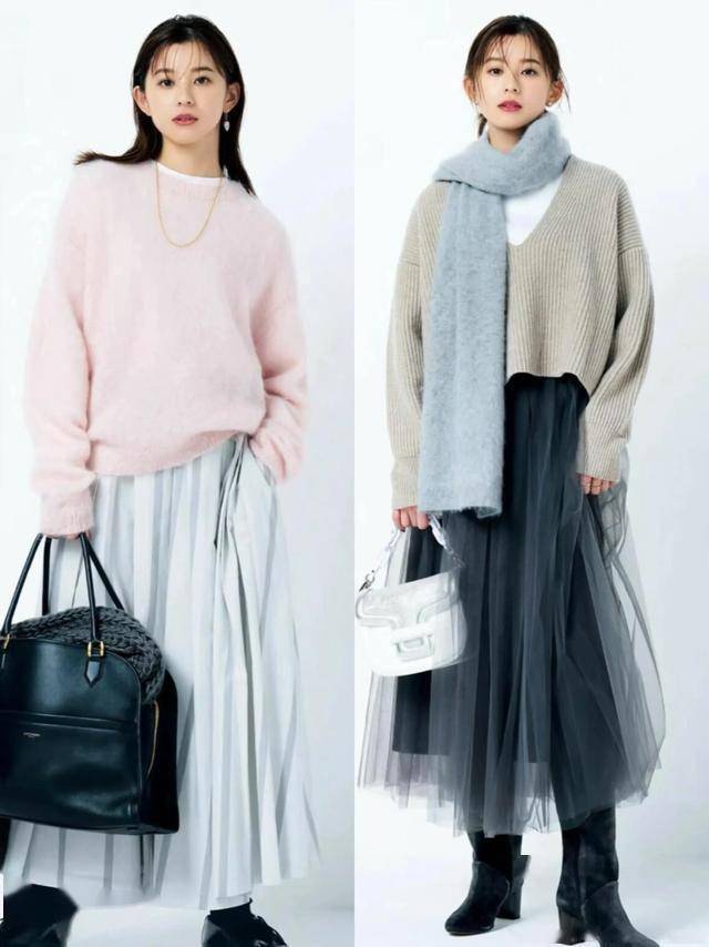 针织衫 + 半裙:软糯毛衣搭配A字裙或百褶裙,自带温暖氛围感,适合日常通勤。