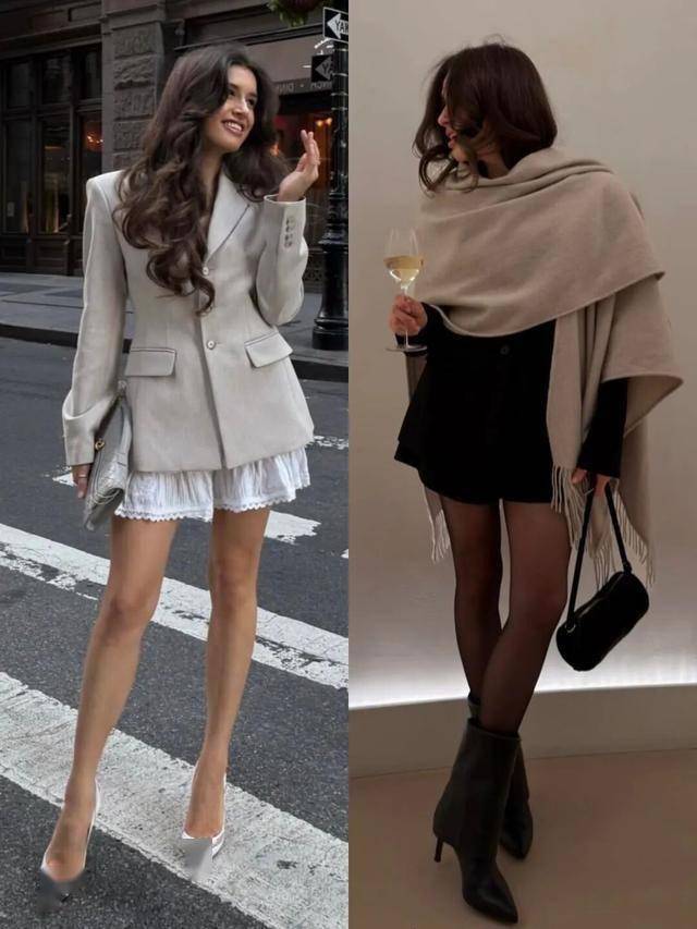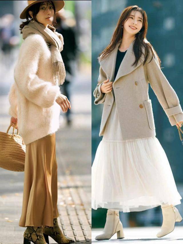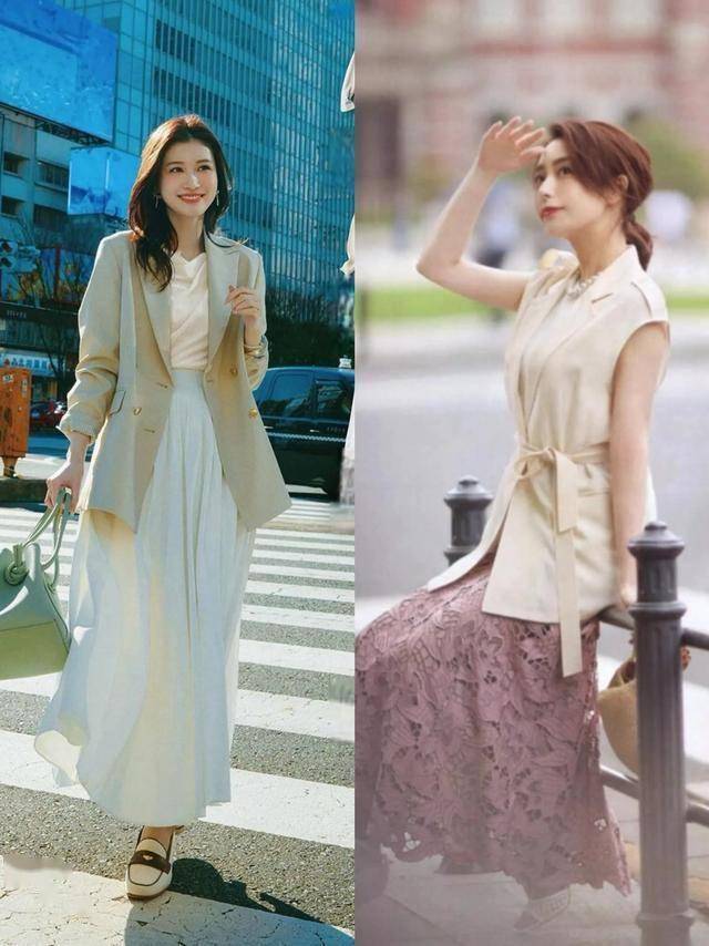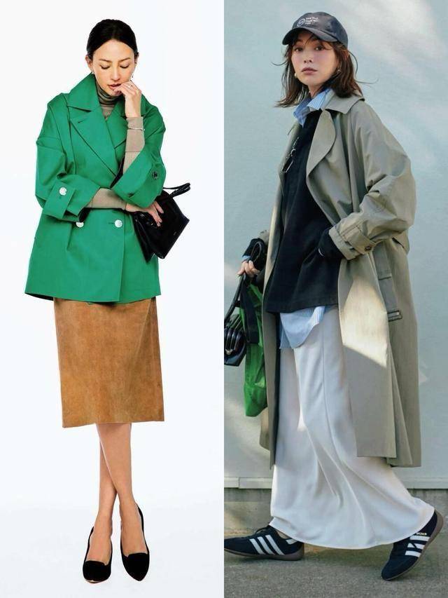 风衣/西装 + 半裙:外搭杏色风衣或灰色西装,提升整体利落度,适合职场女性。