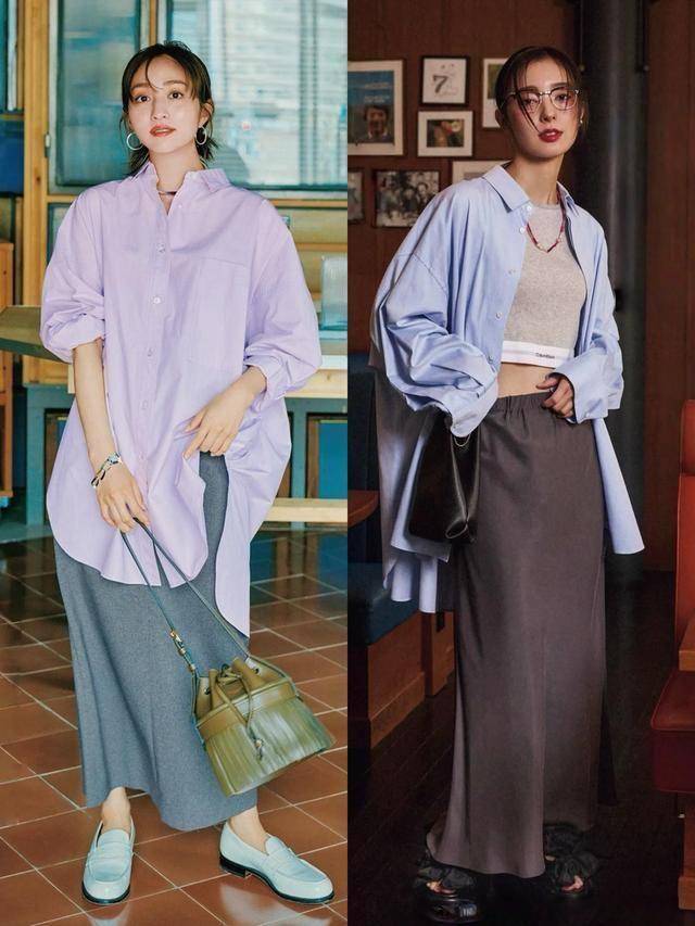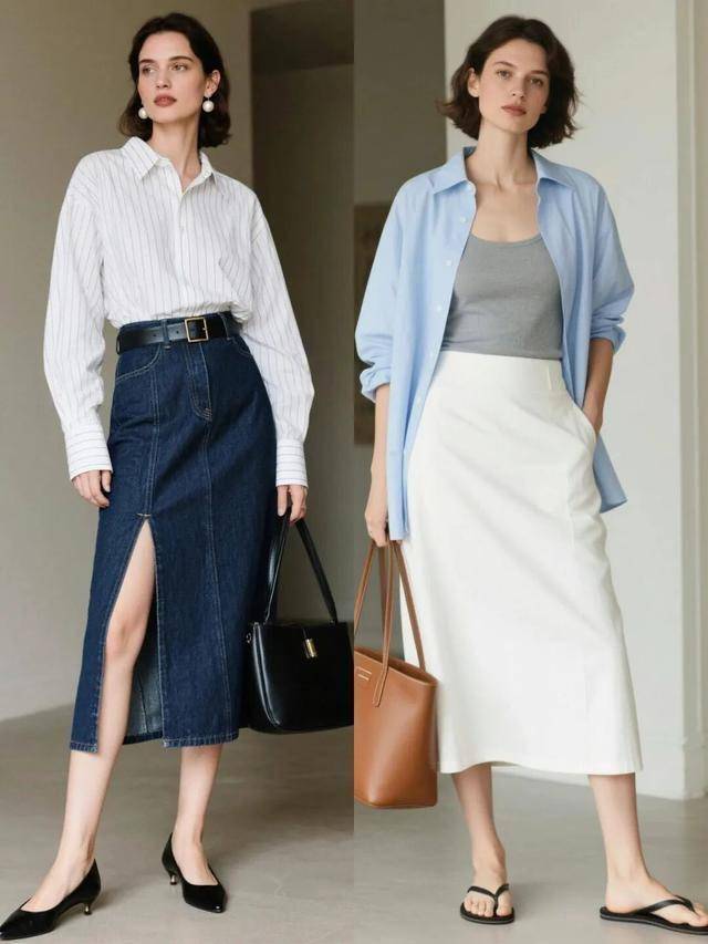 衬衫 + 半裙:挺括白衬衫配白色A字裙,简洁干练;印花衬衫配素色裙,则更显浪漫。