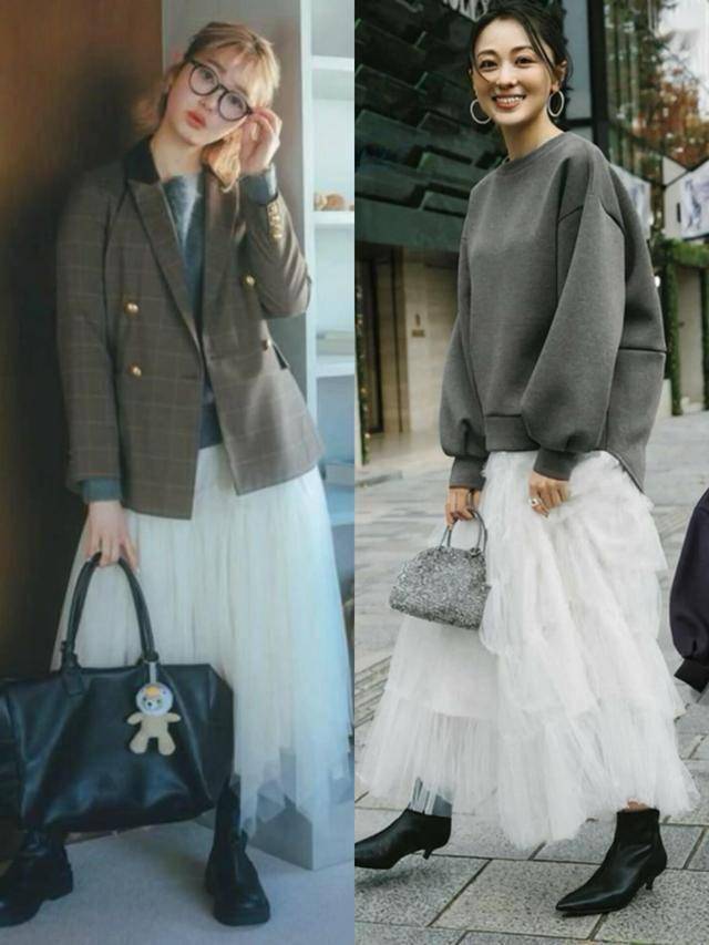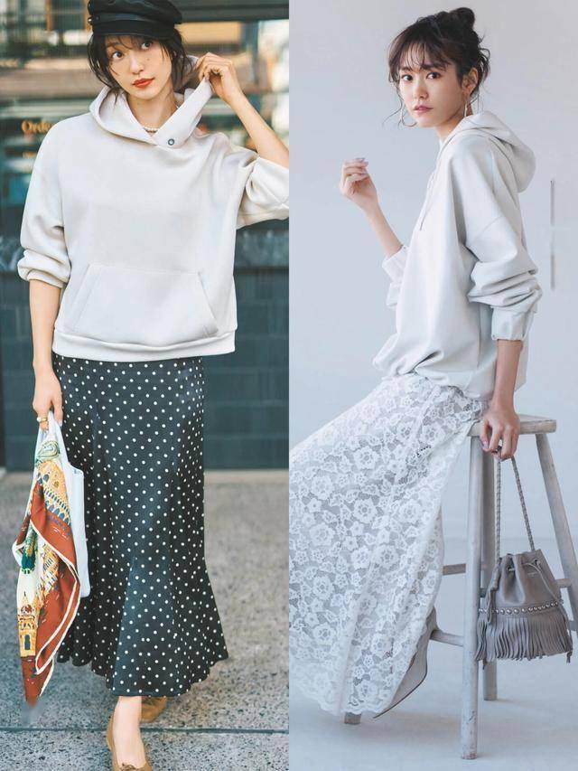 卫衣 + 半裙:休闲卫衣搭配垂感半裙,平衡运动与柔美,减龄又显瘦。