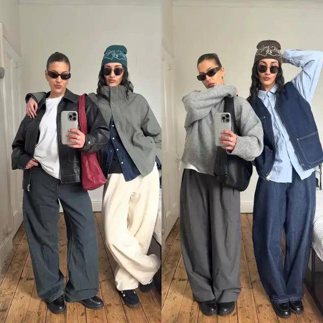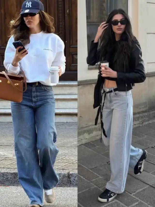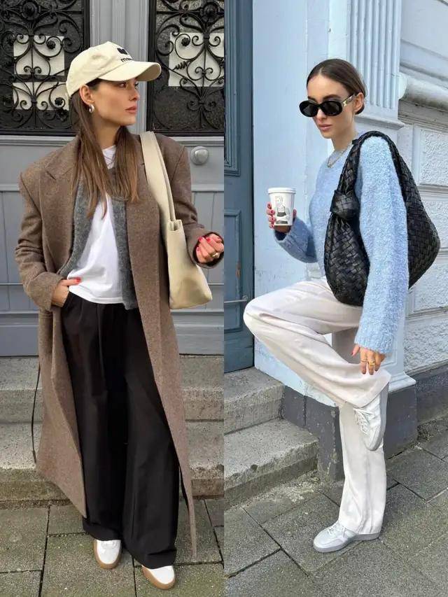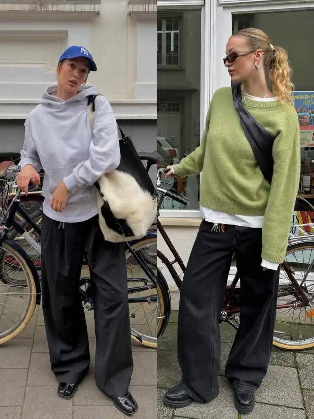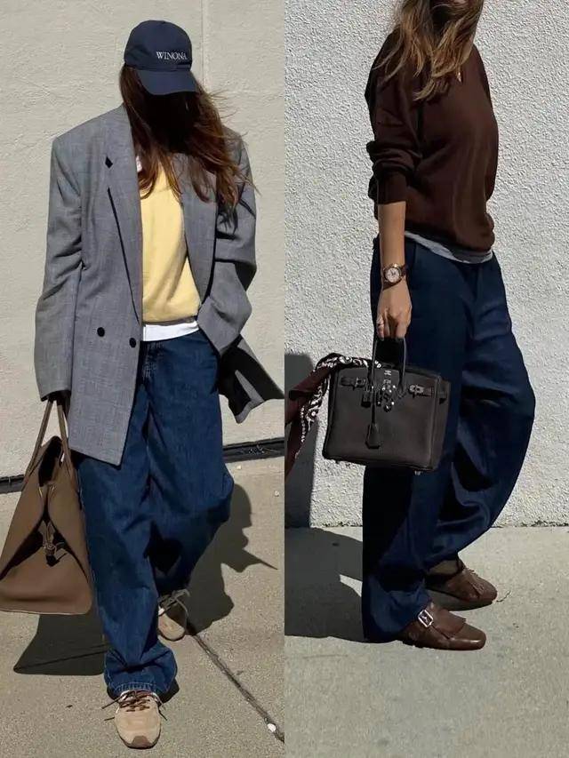 牛仔阔腿裤+德训鞋/厚底帆布鞋,上衣选卫衣或针织开衫,慵懒与时尚平衡。