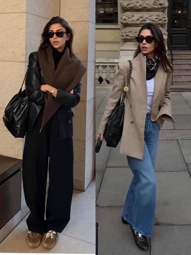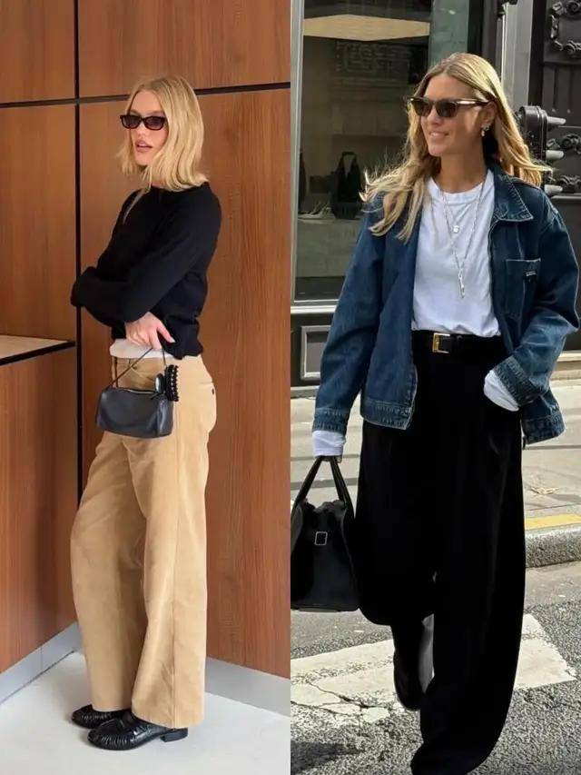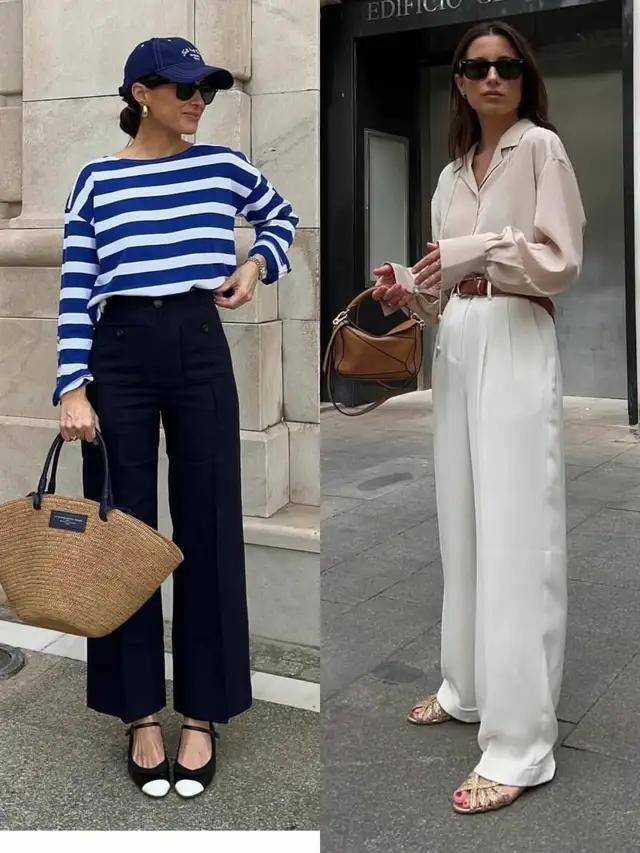 西装阔腿裤+尖头低跟鞋,配色以黑白、卡其为主,内搭衬衫塞裤腰,干练不失精致。