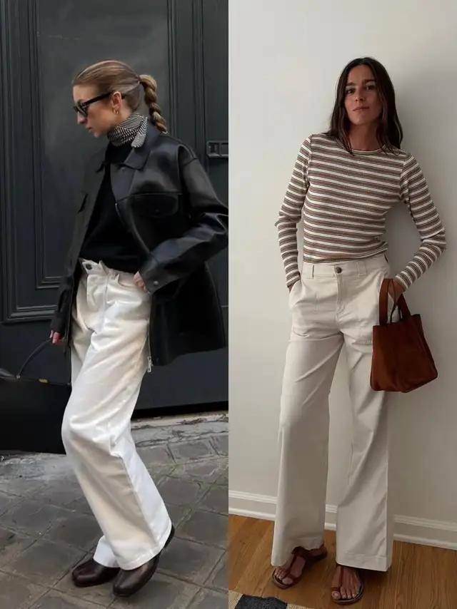 若是用白色的阔腿裤配上棕色皮鞋和一件皮衣外套,整体造型复古大气又极具张力。