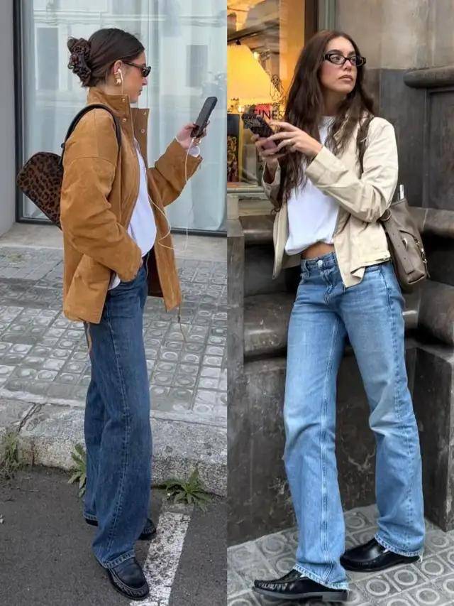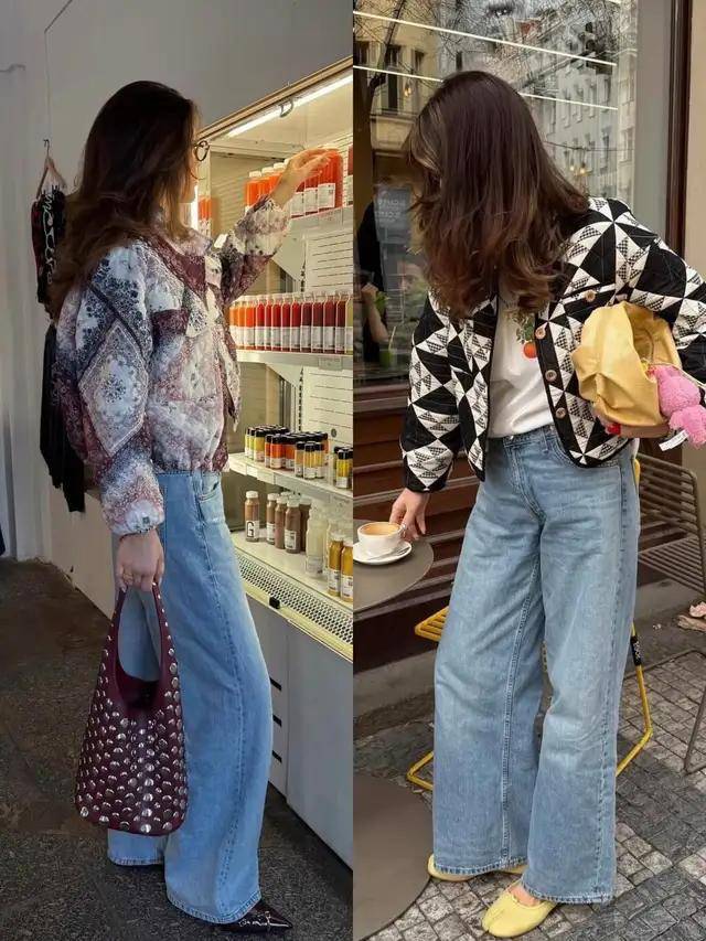 牛仔阔腿裤大同小异,只要面料足够好,挺括有型,穿在身上有垂坠感,都不会显得廉价,但上衣的款式会改变整体风格走向。