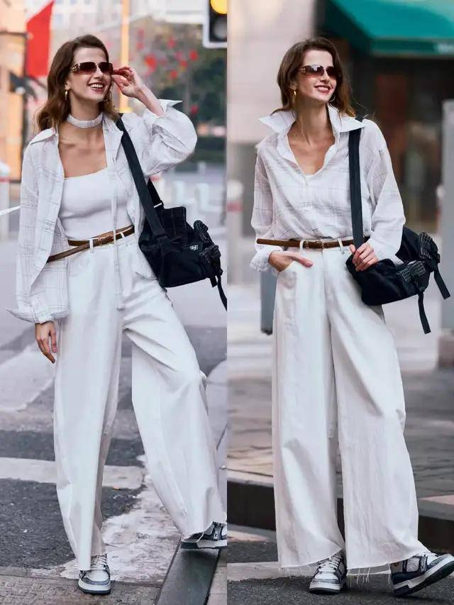 不妨换成一条白色直筒阔腿裤,搭配一双低跟凉鞋与一件免烫浅粉色衬衫,穿的时候将衬衫衣角塞进裤腰,系上一条棕色腰带,高腰线瞬间分明。