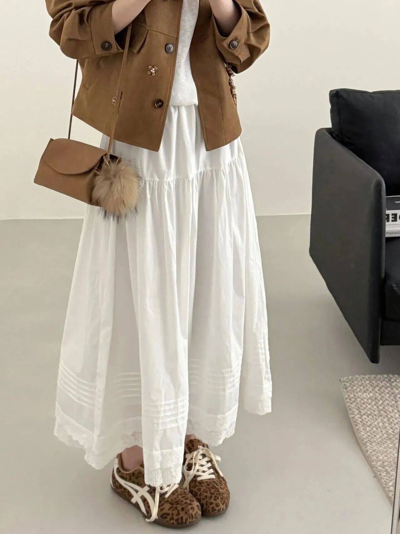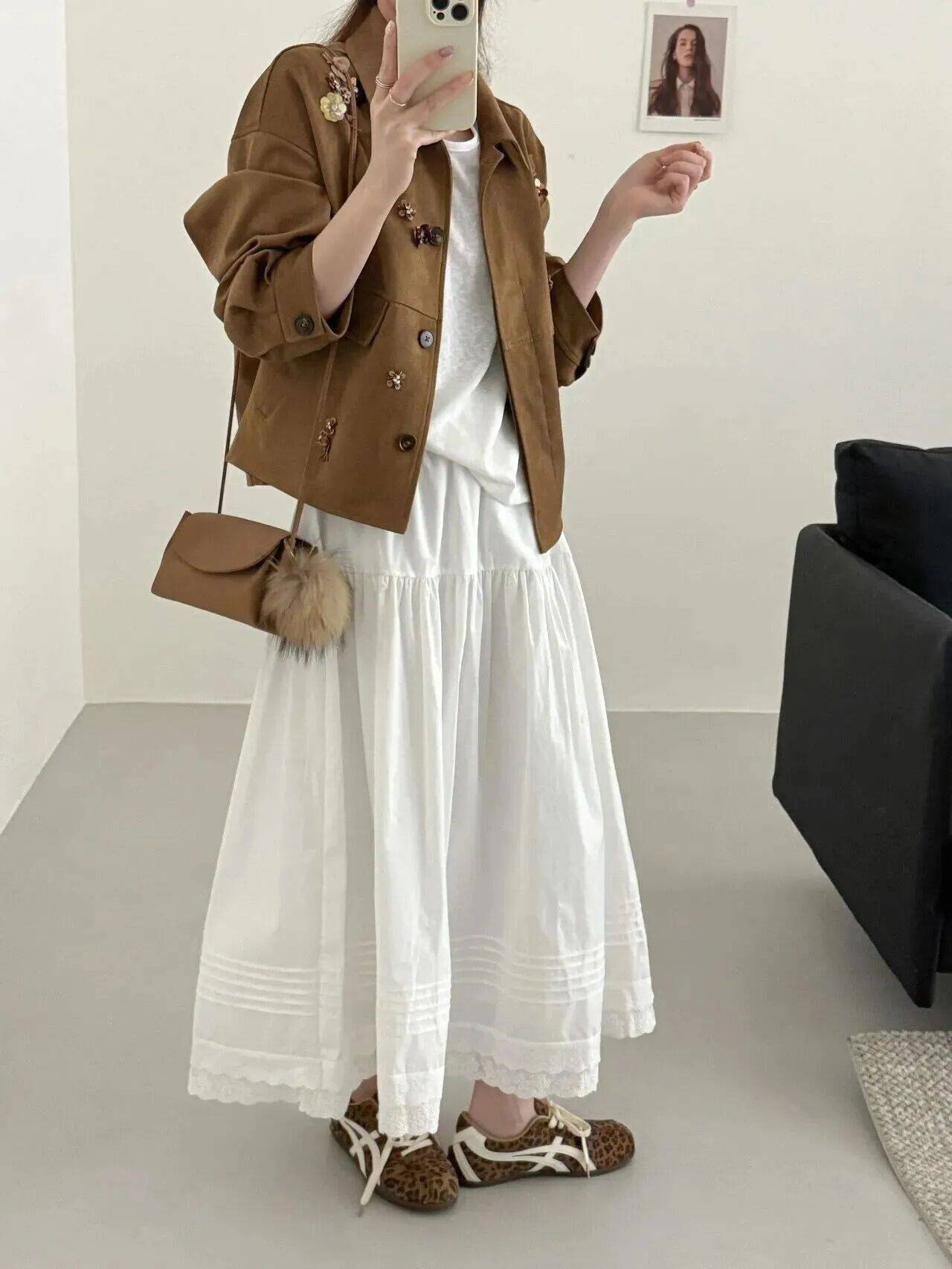 手里拎的美拉德色系的小包包,正好和鞋子形成色彩呼应,让配色找到了一个平衡点。