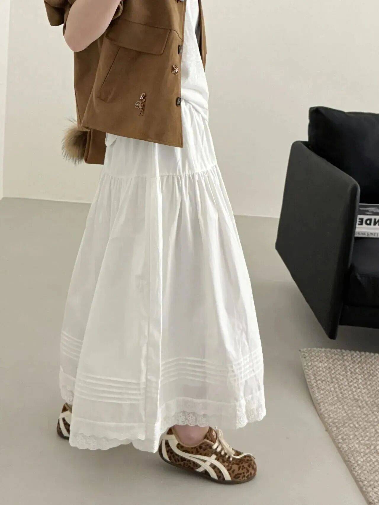 休闲感塑造:平底德训鞋自带运动元素,搭配西装阔腿裤营造慵懒氛围,适合长时间步行或出游,活力感十足。