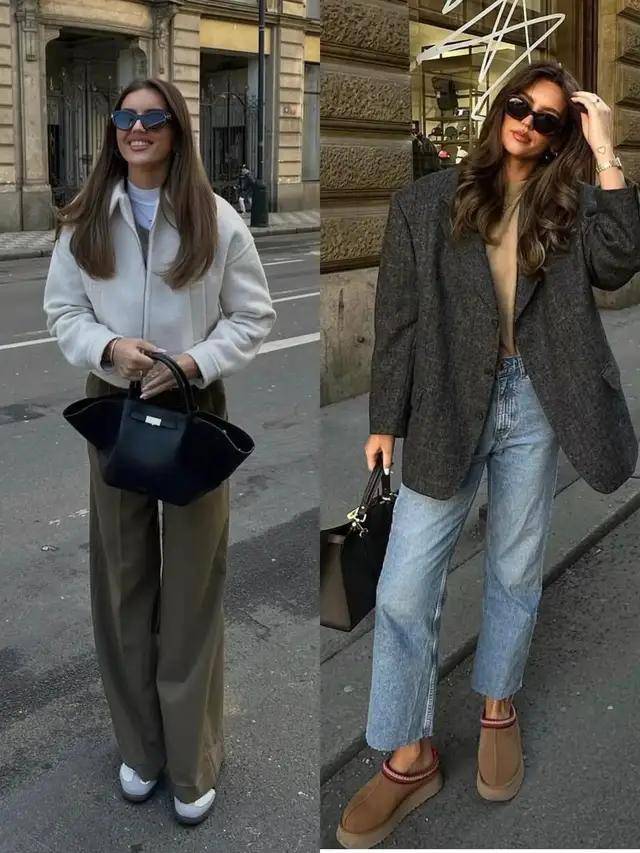 选裤子可以根据身材和风格来决定,偏爱慵懒感就选择最好的阔腿裤或镰刀裤,随性又松弛,搭配黑色德训鞋或乐福鞋,就很有那种慵懒感味道了。