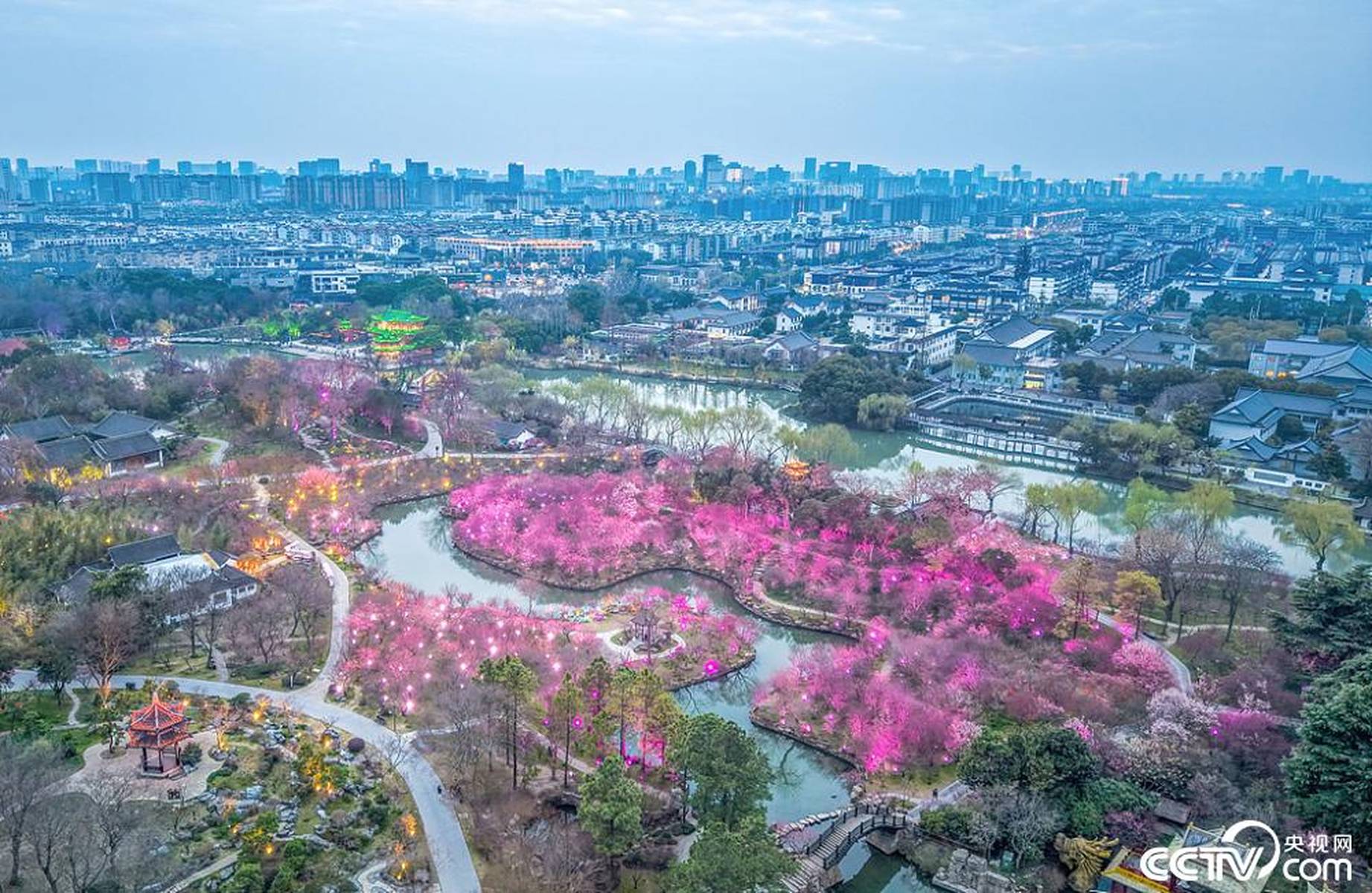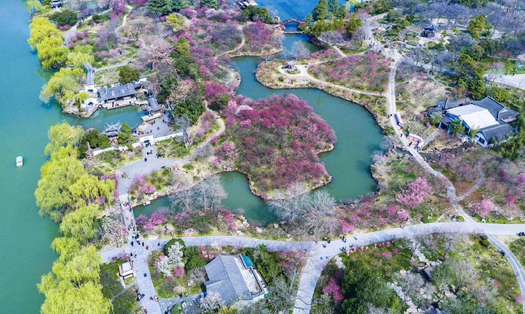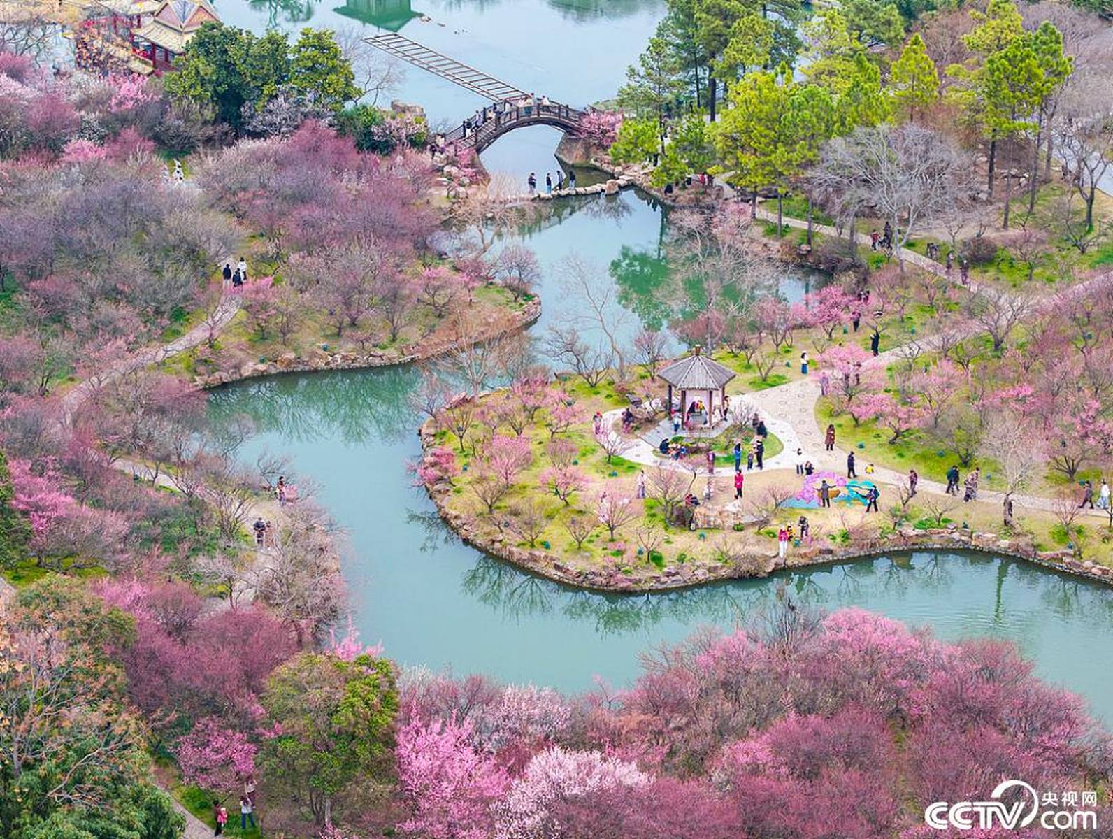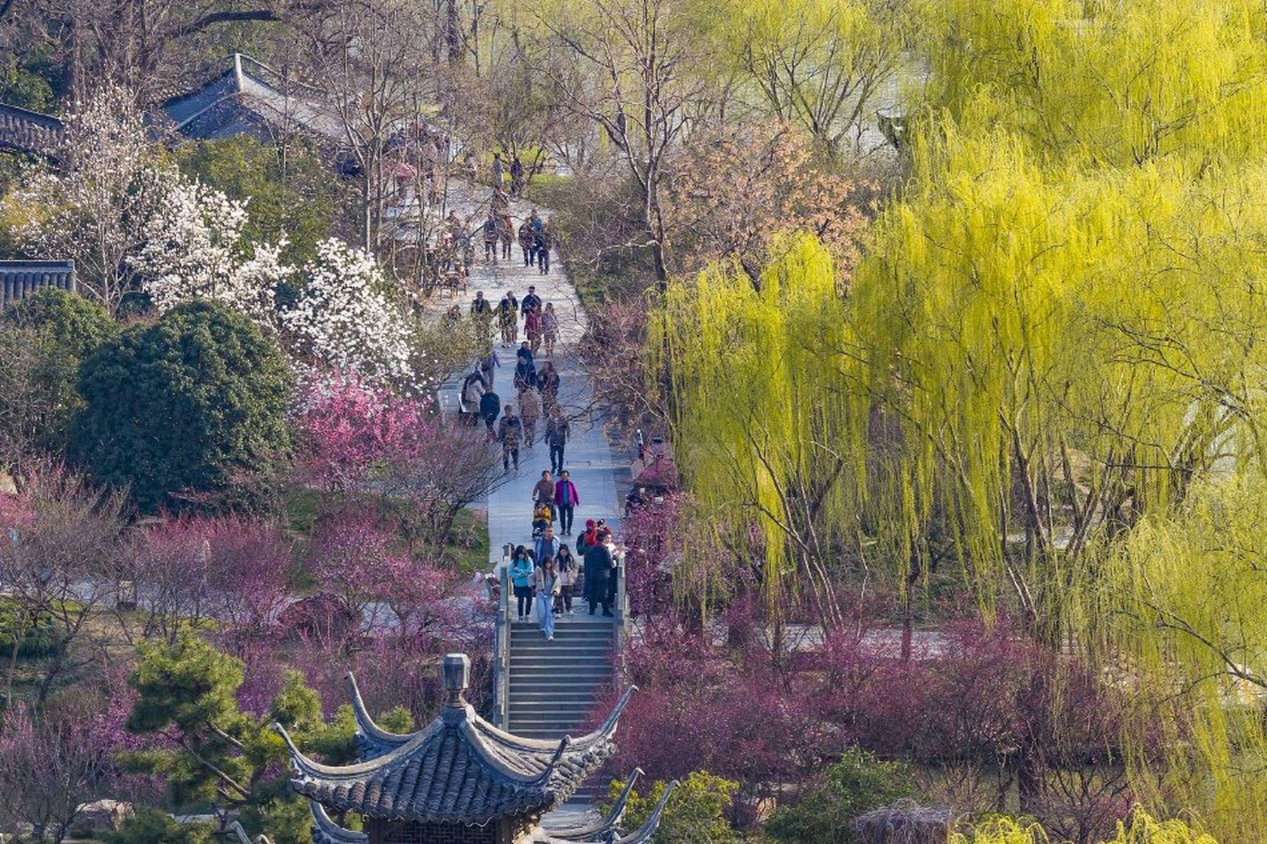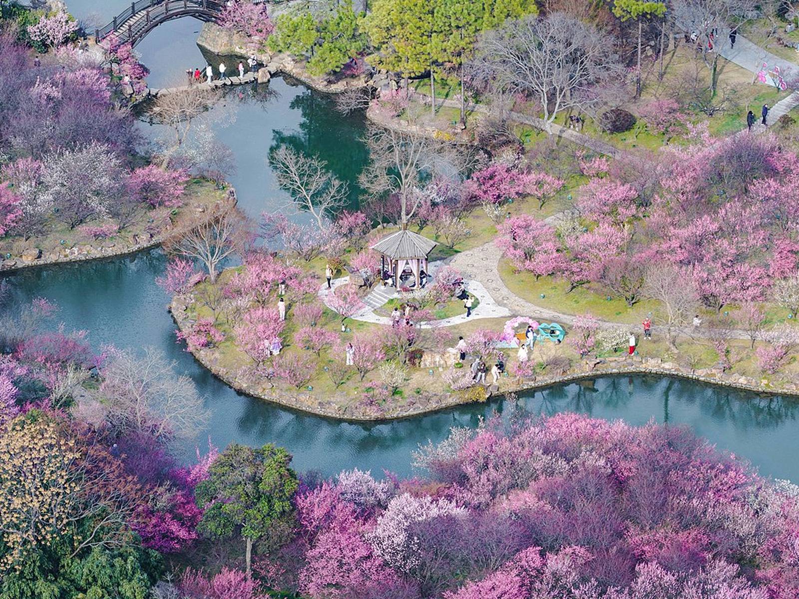 到了3月,瘦西湖的春色愈发浓郁。3月7日,空中俯瞰,“湖上梅林”迎来了最佳观赏期,万株梅花临水而开,仿佛给瘦西湖披上了一层粉色的轻纱,满城都沉浸在醉人的春色之中。3月8日,梅花盛开的美景达到了极致,粉红花海与碧水亭台相得益彰,如诗如画,引得游客们纷纷前来踏青赏春,沉醉在这如梦如幻的美景中。