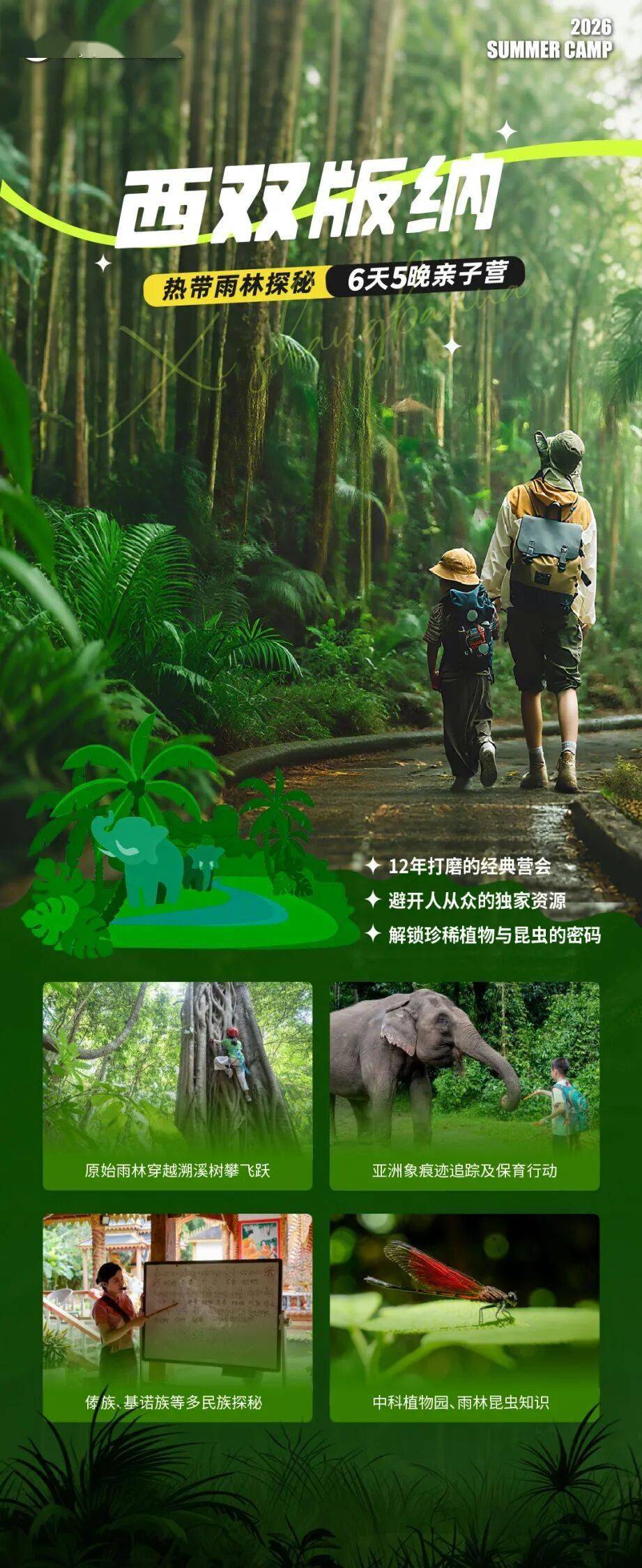 人象和谐之旅:在人象和谐村,孩子通过观察象粪、测量脚印等,学习判断野象活动痕迹;在村民家里看野象闯入村庄的视频,听共生共荣的故事。在野象谷,孩子进入亚洲象生活区,体验“象爸爸”的工作,给大象体检、喂食;在亚洲象博物馆,系统了解象群的演化、生存现状等。