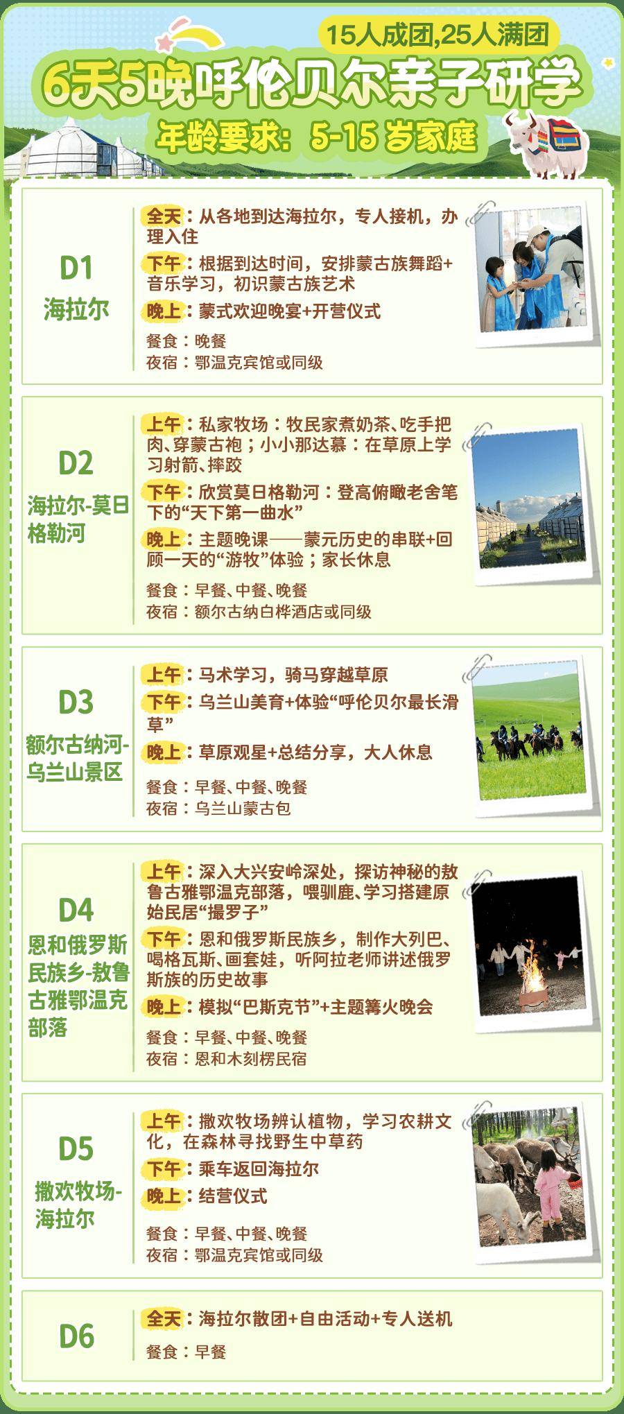 游加的呼伦贝尔亲子营同样是 6 天 5 晚的行程,仅限暑假档期报名。这条线路避开人流,带孩子走进游牧民族的家庭,认识“马背上的民族”。