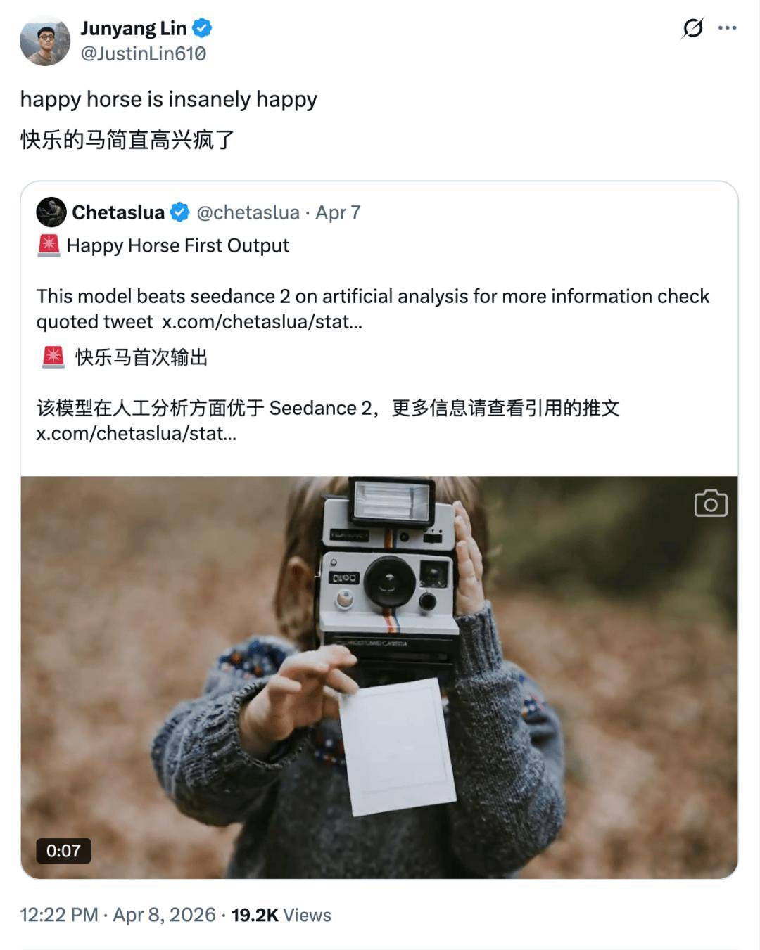 在阿里今天正式宣布之前,前阿里千问大模型负责人林俊旸昨天就在 X 转发了关于 HappyHorse 的消息,附文「happy horse is insanely happy」。评论区当时就有人在猜测,看来 HappyHorse 可能是千问的视频模型。