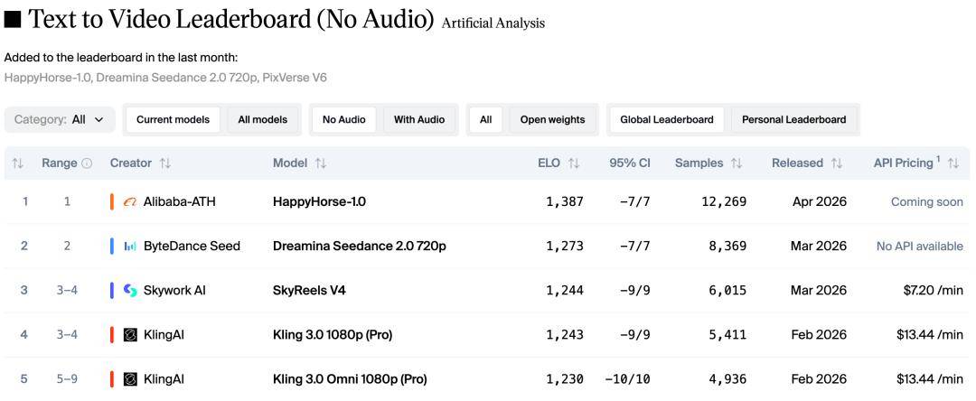 HappyHorse-1.0在AI评测平台ArtificialAnalysis的视频竞技场榜单中,以压倒性表现登顶文生视频、图生视频等多个赛道,直接超越近期热度颇高的字节Seedance2.0