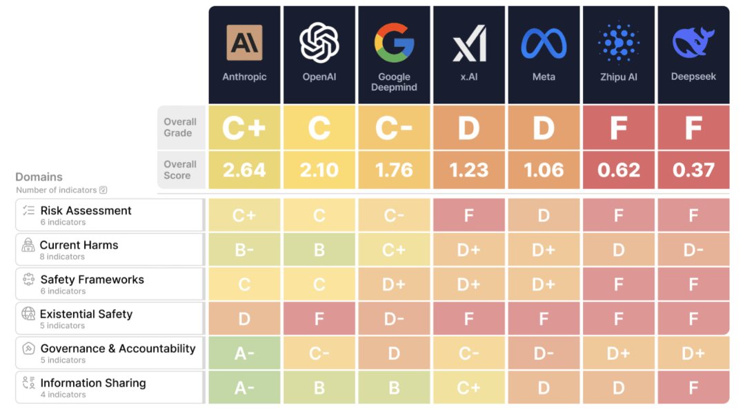 结果显示,即便是得分最高的 Anthropic,在「防范人类生存威胁」这一项上也只拿了个「D」(不及格)。也就是说,这些公司根本没建立起防范 AI 失控的可靠机制,却还在拼命造最强的模型。