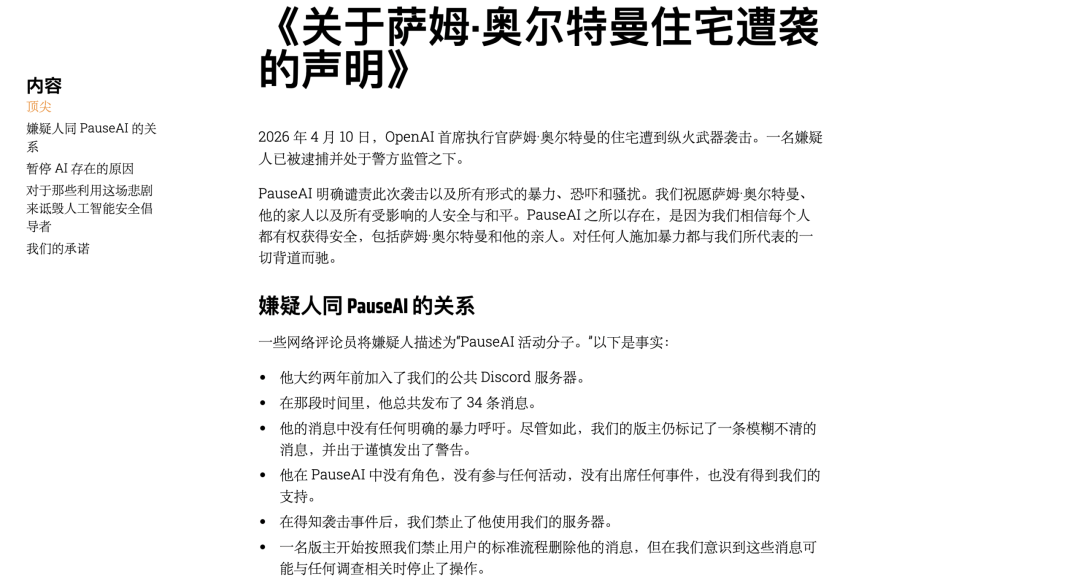 事情发生后,反 AI 组织 PauseAI 几乎立刻发出声明:「我们希望山姆·奥特曼、他的家人以及所有受影响的人平安。PauseAI 的存在,是因为我们相信每个人都有权利获得安全,包括山姆·奥特曼和他的亲人。对任何人施加暴力,都与我们所坚守的一切背道而驰。」