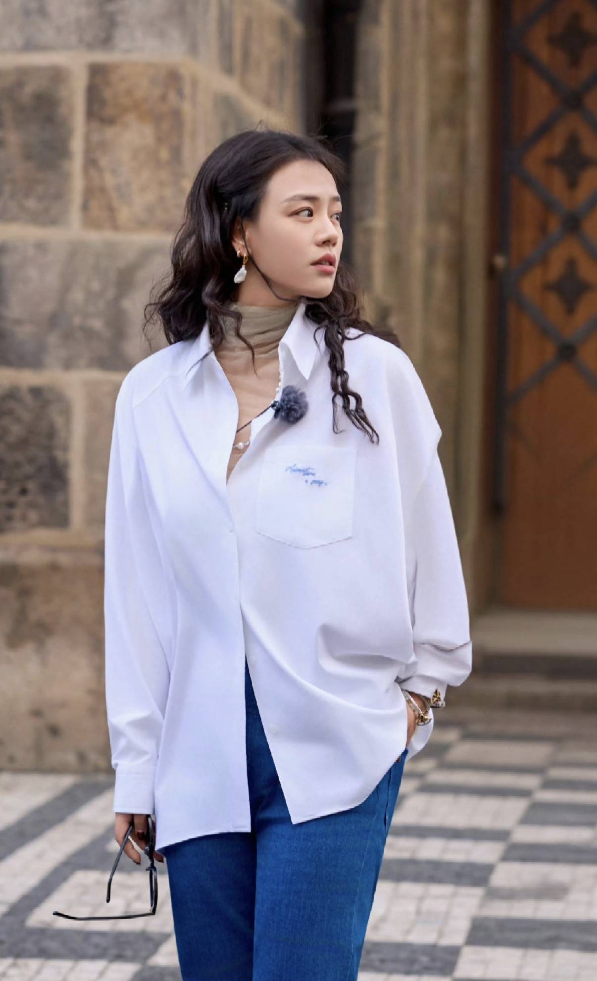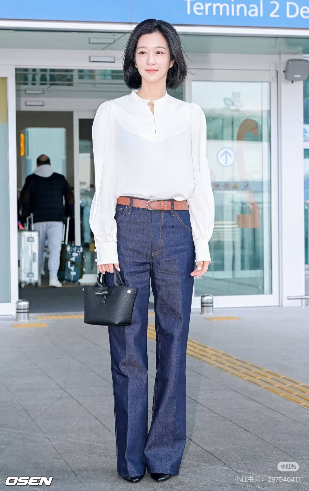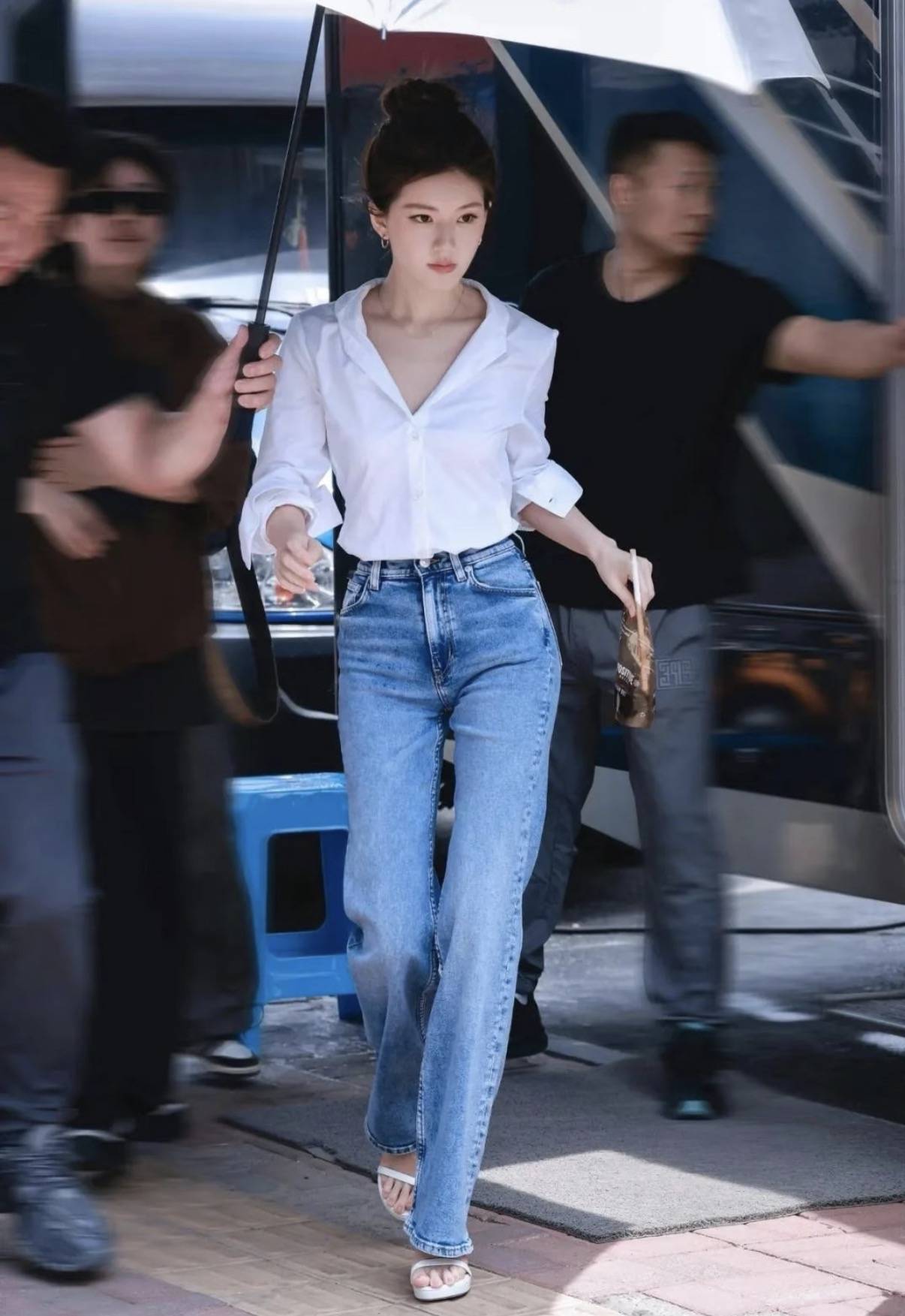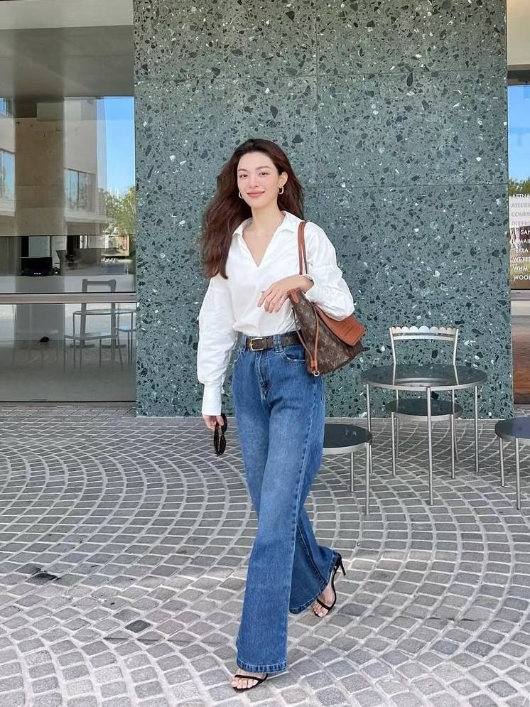 徐睿知白衬衫穿出了温柔干练的反差,微泡泡袖+小立领设计,弱化了衬衫的硬朗感,搭配高腰深色直筒牛仔裤+棕色皮带,瞬间拉高腰线,利落又显气质。