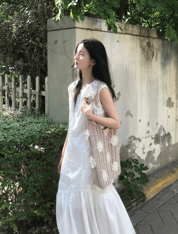 带着文艺感的裙子一般是长款为主,裙摆飘扬更有氛围感,白色镂空且直筒不收腰的设计,不经意间的精致与优雅,搭配帆布单肩包直接封神。