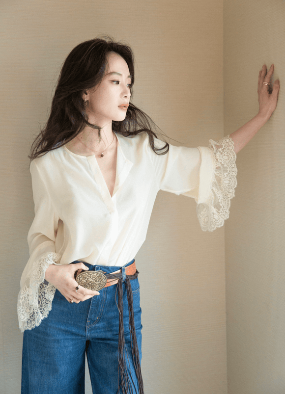 米色V领衬衫上的袖口非常有特色,蕾丝花边的拼接让衬衫一下子精致起来,搭配蓝色牛仔裤,用棕色流苏皮带来装饰整体。流苏皮带一下子把复古文艺感给有效展现出来,妥妥的气质女神。