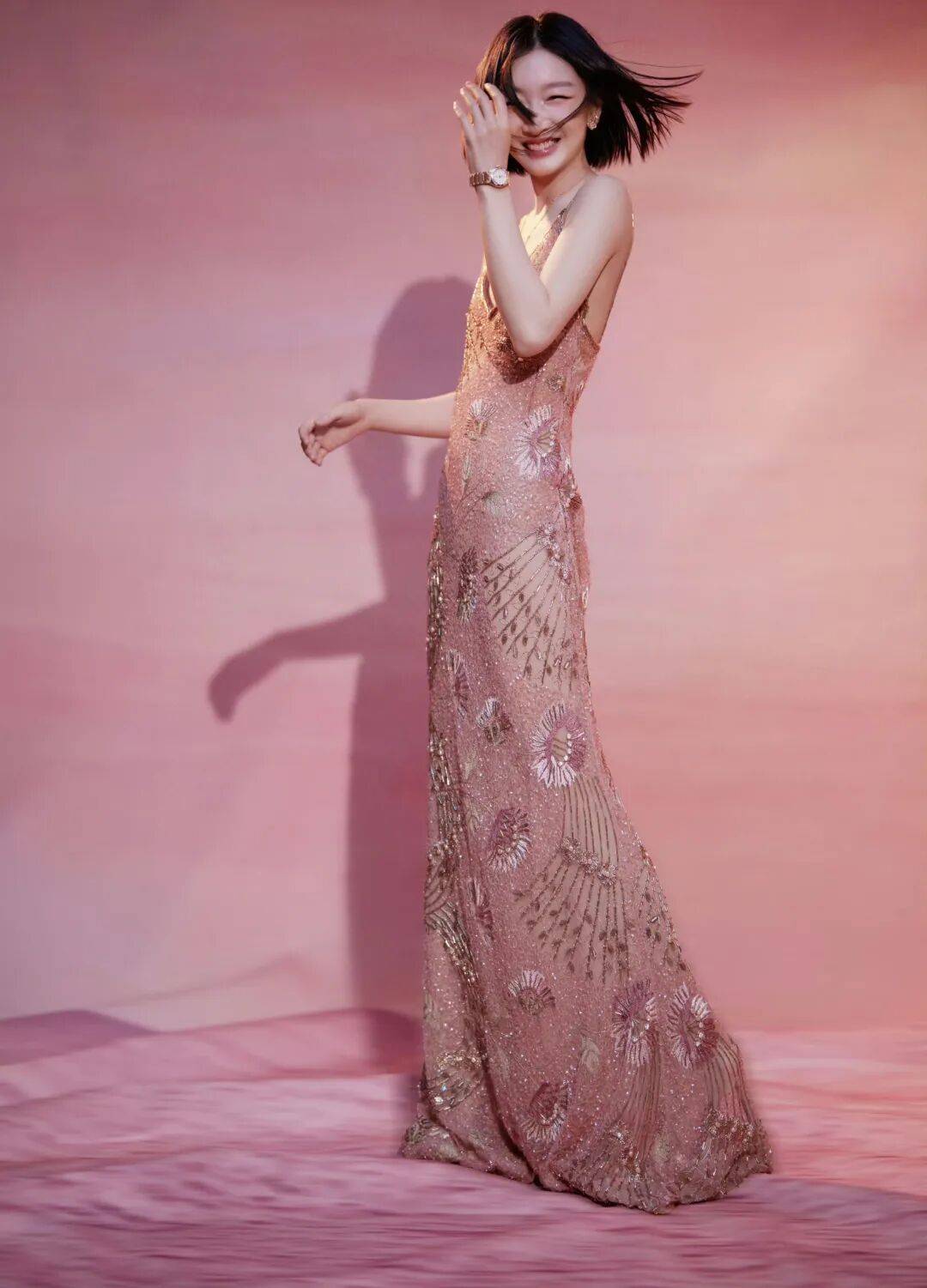 裸粉色基底温柔又显气质,裙身缀满闪钻和金线花卉刺绣,在灯光下波光粼粼,美得让人移不开眼。