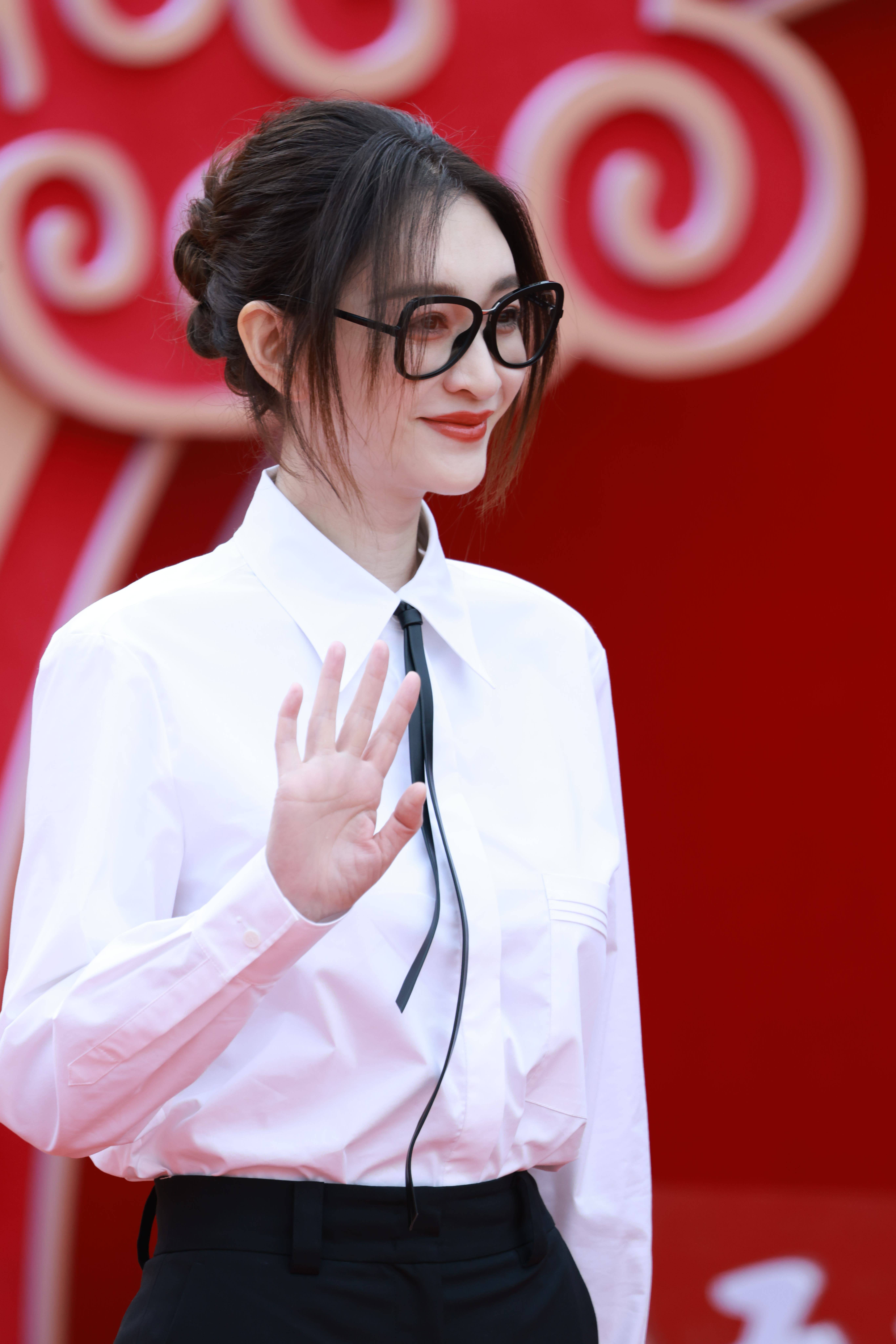 李小冉则穿出了麻辣教师的既视感!尖领白衬衫搭配细黑领带,瞬间解锁又A又飒的学院风,搭配黑框眼镜和盘发,干练中带着清冷贵气。版型利落不拖沓,中性又不失女人味~