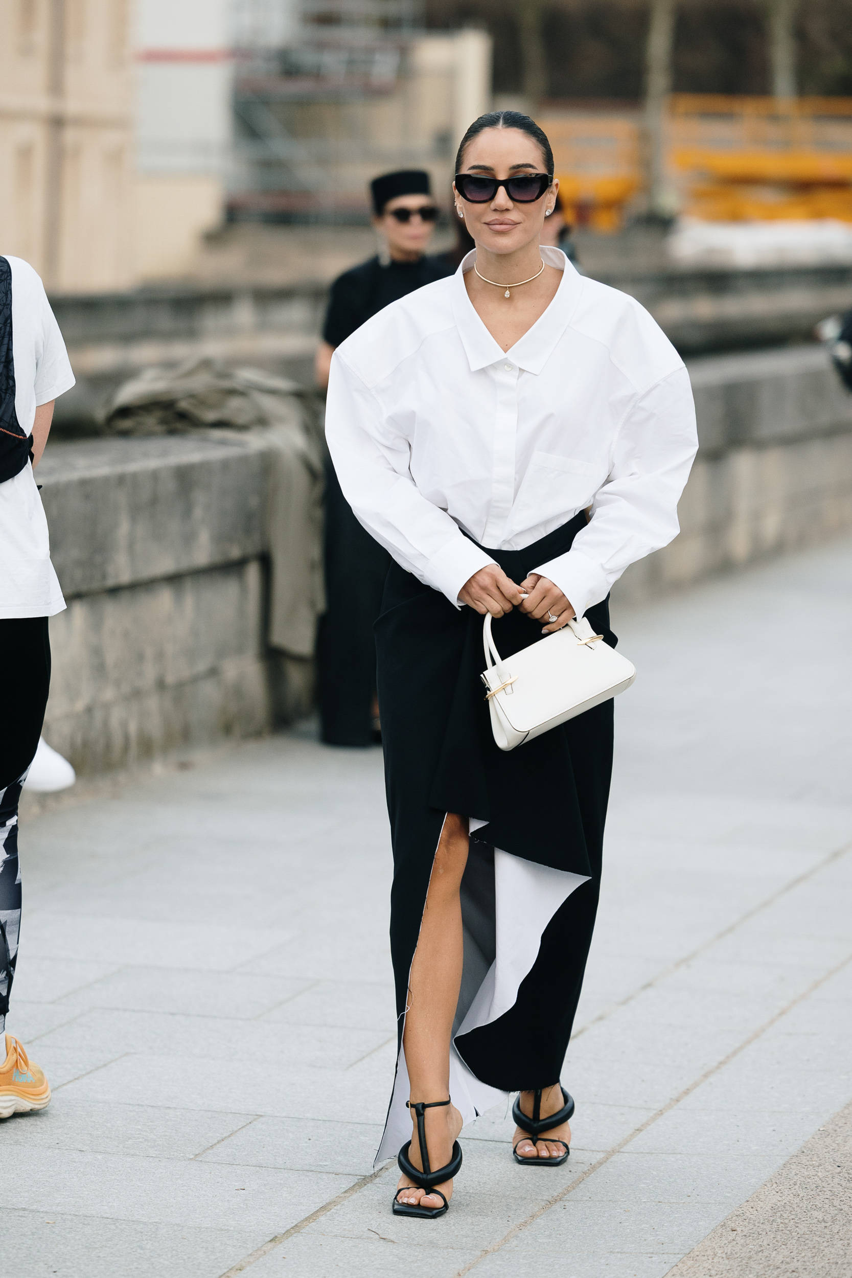 Oversize白衬衫又A又慵懒,廓形剪裁自带松弛气场,搭配不对称开叉黑半裙,随性又充满设计感。松弛又有辨识度。